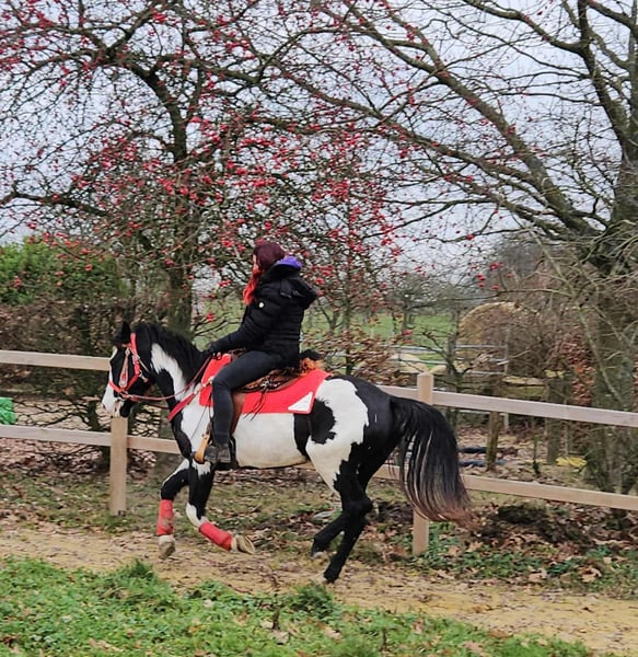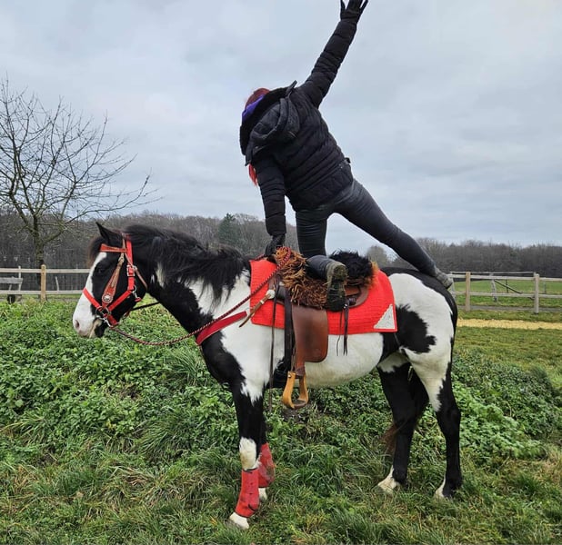 Paint mare „Kaila“ – gentle, calm, and versatile Age: 5.5 years Height: approximately 1.52 m (15.1 hh) Price: €7,600 AKU: available ✨ Description: This beautifully marked Paint mare convinces with her balanced temperament and friendly, pleasant nature. In daily handling, she is well-behaved, human-oriented, and straightforward. Despite her young age, she appears calm, relaxed, and resilient. Under saddle, she works cooperatively, eager to learn, and reliable. She enjoys working, is attentive, and provides a confident, relaxed riding experience. Especially suitable for leisure riding and Western disciplines, she is versatile and adaptable. 🐎 Perfect for: Riders seeking an uncomplicated, friendly, and dependable leisure partner. Thanks to her comfortable size, she is also well suited for teenagers or smaller adults. Ideal for recreational riding, trail rides, and hacking. 🩺 Our horses are regularly: – dewormed – attended to by the blacksmith – osteopathically checked 🛍 Farm shop: Western saddles, bridles, and accessories 🚛 Transport and equipment can be organized affordably upon request. Our services: ✅ 3-month exchange guarantee ✅ Trial ride: €35, each additional horse €25 (credited if purchased on the same day) ✅ €100 immediate discount for pickup/transport on the same day ✅ Personal and honest advice 📞 Please inquire exclusively by phone: 0171 – 4001968 🕗 Available daily from 8 a.m. to 8 p.m. ⚠️ No emails or WhatsApp messages ⚠️ All information provided without guarantee