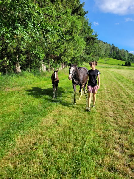 Wir suchen für unsere BS Coosaders Boogie ein neues, liebevolles Zuhause. Boogie ist eine 2018 geborene Paint-Horse-Stute mit einem Stockmaß von ca. 1,52 m. Sie stammt ab von Colonel Coosader und ist seit 2022 in unserem Besitz. Sie läuft barhuf und benötigte bisher keine Eisen. Sie wird regelmäßig geimpft und entwurmt. Im Winter stehen unsere Pferde nachts in der Box, im Sommer genießen sie 24 Stunden Weidegang. Mit Boogie habe ich mein Westernreitabzeichen 4 absolviert und Turniere in der Leistungsklasse 4 besucht, bei denen ich in der Pleasure, Horsemanship, Showmanship und Ranch Riding auch platziert war. Die Turnieratmosphäre hat sie stets ruhig und souverän gemeistert. Lehrgänge und intensives Training sind jedoch nicht unbedingt ihre Lieblingsbeschäftigung. Sie geht lieber ins Gelände, trotzdem macht sie bei der Platzarbeit willig mit. Besonders wohl fühlt sie sich bei ruhigen Ausritten. Dort ist sie sowohl in der Gruppe als auch alleine gut händelbar. Boogie braucht eine feste Bezugsperson, ist auf jeden Fall ein Ein-Mann-Pferd und fremden Reitern gegenüber zunächst misstrauisch. 2024 hat Boogie ein wunderschönes Hengstfohlen bekommen. Sie hat beim ersten Versuch mit Frischsamen direkt aufgenommen und sowohl die Trächtigkeit als auch die Geburt problemlos gemeistert. Daher können wir sie uns auch weiterhin gut in der Zucht vorstellen (5-Panel N/N). Leider leidet Boogie bei schlechtem Heu an Husten. Während der Sommermonate zeigt sie keinerlei Symptome. In der Winter- und Frühjahrszeit kann der Husten jedoch bei nasskaltem oder nebligem Wetter auftreten. Aus diesem Grund wird sie bevorzugt als Zucht- oder Freizeitpferd abgegeben. Wir wünschen uns für Boogie ein Zuhause mit einer festen Bezugsperson, die ihr Zeit gibt und sich den Umständen anpasst. Für weitere Informationen stehe ich gerne für ein persönliches Gespräch zur Verfügung.