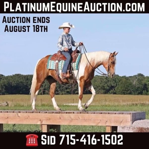 ONLINE AUCTION Place your bids at www.PlatinumEquineAuction.com Starting Bid $3500 Auction ends August 18th, 2024 Need a new saddle? Check out White Rock Saddles on our website or Facebook! Shinin Cat (“Shada”) – 2018 Registered APHA Mare, that stands 14.2hh. Have you ever seen such a CUTE mare? From her unique color and gorgeous long mane, to her sweet, tolerant, curious personality, Shada is the unicorn most people only dream of owning in their life. This bombproof, beautiful mare is confident and SAFE. She’s been ridden all over by adults and children alike.While she has a great handle on her, stops on a dime, spins, sidepasses to any obstacle and can work a gate or handle a rope; she can also dial it back in a moment’s notice to accommodate even the greenest riders. Shada has been used as a kids lesson horse and is incredibly kind to riders of all levels. Standing at 14.2, she is just the perfect size for kids and adults. Shada is a stout girl and surefooted, ready to hit the trails or head to the arena. You can comfortably ride her out with other horses or on her own. She is ready and willing to do anything with you. On top of her long and valuable resume, this mare also boasts some big names on her papers, including High Brow Cat, Shining Spark, and more. She is friendly, loves kids, and will take care of whoever is riding her. Shada has one of the sweetest personalities and will catch you in the field! She is super safe and has no silly business about her at all. Hop on her bareback and ride off into the sunset, or throw a saddle on her after time off. She will be the same for you every day. Shada is very comfortable at all the gaits! She has all the buttons you could want, whether she is taking the kids for a ride or just being handy around the ranch. This confident girl does not spook at a thing. You can carry the flag, drag logs, open gates, cross bridges and tarps, anything you can come up with. Outside of work, her favorite hobbies include swimming and playing soccer with the big ball. She’s been trail ridden extensively. Hops in and out of the trailer. Hauls great! She’s ponied other horses, and also been ponied. With the APHA market and shows exploding, there has never been a better time to own a registered Paint horse! This mare could also be registered Pinto and Palomino if you’re interested in hitting other color shows as well. Shada is very comfortable with having her feet handled. You will be your farriers new favorite client! She stands tied, and loves her bathes! She is happy to live inside or out. No vices. 100% sound. Passed PPE with flying colors. This beautiful girl is ready to meet her forever family! For more info contact Zacharias Horsemanship Sid 715-416-1502 Located in Adair, OK. ONLINE AUCTION Place your bids at www.PlatinumEquineAuction.com Starting Bid $3500 Auction ends August 18th, 2024 Need a new saddle? Check out White Rock Saddles on our website or Facebook!