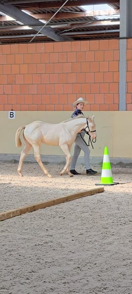 …und ich suche meinen zukünftigen Lieblingsmensch! Ich bin am 22.04.2025 geboren und erkunde seitdem immer offen und neugierig die Welt. Meine Farbe ist smokey cream und ich bin bei der APHA und dem PHCG registriert. Ich bin sehr umgänglich, menschennah, halfterführig und artig beim Schmied. Anhängerfahren ist für mich kein Problem. Natürlich bin ich gechippt, geimpft und entwurmt. Bei der Zuchtschau in Bremen/Ritterhude bin ich mit der Note 8,15 Siegerfohlen geworden. Ich habe mich damit für das Bundesfohlenchampionat in Darmstadt qualifiziert, wo ich 7. geworden bin. Wenn du mich kennen lernen möchtest, melde dich ganz schnell bei meinem Besitzer Frank Heldt (0176-34507184)