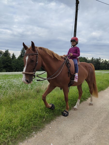 Shining ist ein 17 Jahre alter Saddlebred Wallach. Seit 5 Jahren ist er als Reittherapiepferd für Kinder bis 12 Jahren im Einsatz und macht dabei eine unglaublich schöne Figur. Er wird gebisslos und mit einem Physio Reitpad geritten. Er mag Platzarbeit lieber als Ausritte. Außerdem hat er 4 Gänge und kann einen ausladenden Showtölt gehen . Regelmäßige Zahnarztbesuche und alle 6 Wochen Barhufpflege bekommt er auch. Im Sommer trägt er vorne gerne Hufschuhe an. Er ist aktuell als Reitpferd für schwerere Erwachsene nur bedingt geeignet, da er einen langen und etwas instabilen Rücken hat, der erst wieder auftrainiert werden muss, wenn er gesund mehr als 60 Kg tragen soll. Er ist vom Boden sehr zuverlässig zu händeln, fast nicht zu erschrecken, obwohl er schon ein kleinerer Ferrari sein kann. Ein klassisches Showpferd eben. Er wird nur in die besten Hände abgegeben. Das bedeutet für mich einen Menschen oder Familie, der/die viel Liebe, Zeit und Geduld hat. Und nur in einen großen Offenstall, am besten mit Paddocktrail. Eine kleine, ruhige Herde reicht ihm. Er kann problemlos mit Stuten gehalten werden. Was er nicht mag ist Hänger fahren. Allerdings haben wir dieses Thema in den letzen Jahren nicht weiter behandelt. Wer also ein Kinder/Therapie/Show/Familienpferd sucht: meldet euch :)