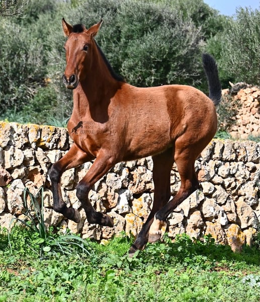 Este potro PRE (Andaluz con certificado de raza de la ANCCE), nacido en verano de 2024, ¡ya es una verdadera belleza! Todavía puede estar con su madre, pero pronto será destetado y en este proceso se busca su hogar para siempre. Vive en un sistema de cría robusto las 24 horas y, gracias a los duros suelos de Menorca, tiene una excelente calidad de casco y está bien conformado. A pesar de su vida robusta, es increíblemente cariñoso y se acerca amistosamente en cuanto uno llega al prado. Su ascendencia hace que los amantes del caballo español se emocionen de inmediato. Por parte paterna, desciende de SENILLOSA, con ESCALERA en sus ancestros. Por parte materna, es nieto de DARTURO III, que proviene de la cría RETAMALES, y su madre también tiene sangre de PLAZA DE ARMAS y CAMPO BAJO. Esta excelente selección de cría se hace notar en él, ya que no solo es hermoso con una cabeza típica de la raza y un exterior barroco, sino que también tiene un gran movimiento que presenta bien a pesar de los suelos pedregosos. Un potro feliz y amigable a un precio justo por esta calidad. Su padre mide 170 cm y él también será un chico más grande. Actualmente se encuentra en Menorca. Videos y ascendencia disponibles a solicitud. Con gusto organizo una revisión veterinaria, transporte o su viaje, si desea venir a verlo en persona. Más detalles en mi página o en conversación. Saludos desde España.