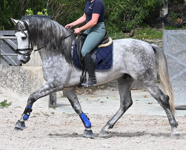 Dieser 2021 geborene PRE Hengst (Andalusier mit Rassenachweis der ANCCE) ist ein Bilderbuch-Spanier! Schön barock, wallende Mähne, spanischer Esprit, waches aber sanftes Auge und ein graziler Kopf. Dazu bewegt er sich noch unfassbar gut, er fliegt wirklich nur so über den Platz, wie ich es selten bei einem Spanier gesehen habe. Das kommt nicht von ungefähr, denn er ist ein Sohn des weltbekannten Dressurmeisters ROMERO DE TRUJILLO! Der Papa räumt alle Schleifchen und Preise ab, die es in der Dressurwelt des PRE zu ergattern gibt und dieser sein Sohn, hat auch großes Potenzial, um dressurambitionierte Reiter glücklich zu machen. Dazu kommt noch JUDIO VII als Großvater, der bis heute einer der wichtigsten Hengste der Rasse war und vermutlich für immer unvergessen bleibt. Daher kommt dieses klassische-spanische Exterieur und das Leuchten in den Augen, denn die Judios sind weltklasse Pferde, auch in der Morfologie und sehr sehr beliebt in der Welt des PRE. Der junge Mann misst schon stattliche 167cm (wächst noch!) und da es dem Züchter wichtig ist, dass seine Pferde langsam heranwachsen und nicht überfordert werden, war er lange in der Hengstherde auf vielen Hektar Land und ist aktuell basis angeritten. Er ist sehr arbeitssam, man braucht nur etwas Feingefühl sein Feuer zu zügeln,und noch tut er sich etwas schwer, immer zu 100% aufmerksam zu sein, was aber absolut normal ist, für ein Jungpferd mit Energie. Ohne Zweifel ist dieser Hengst eine hervorragende Option für ambitionierte Reiter die das spanische Pferd und die Dressur lieben, sowie für Züchter! Er ist bereits gekört, hat aber noch nicht gedeckt. Sollte Hengsthaltung nicht möglich sein, besteht die Möglichkeit der Kastration vor Ort. Preis der Qualität entsprechend! Aktuell steht er auf Mallorca! Videos und Abstammung gerne auf Anfrage. Ein Top Pferd zu einem sehr fairen Preis. Gerne organisiere ich vor Ort eine AKU, Beritt, Transport oder auch ihre Reise, sollten Sie persönlich zum Anschauen kommen. Details dazu gerne auf meiner Seite oder im Gespräch. Saludos aus Spanien