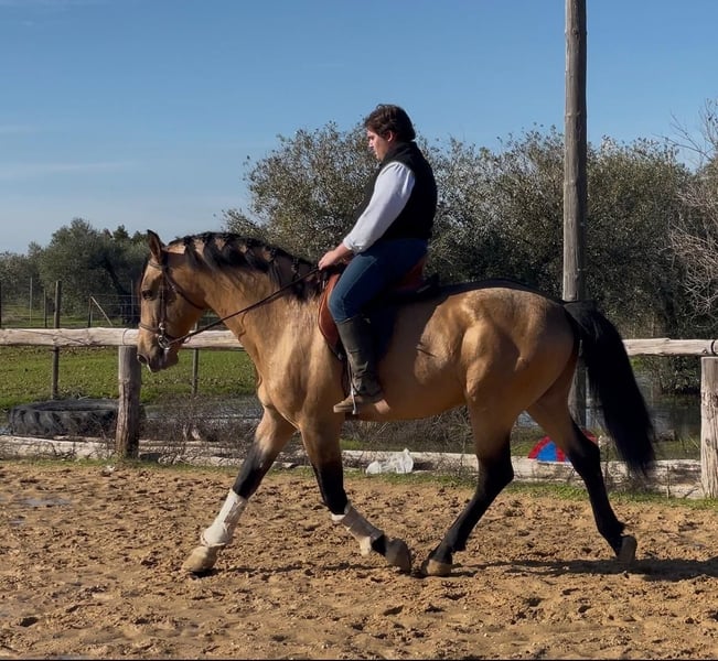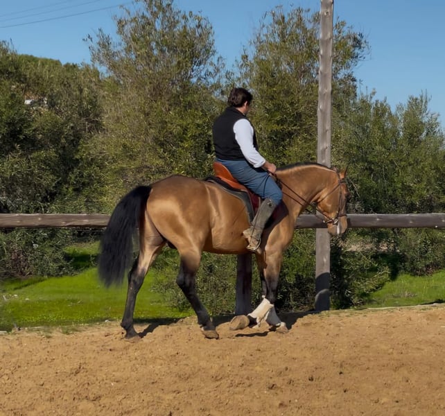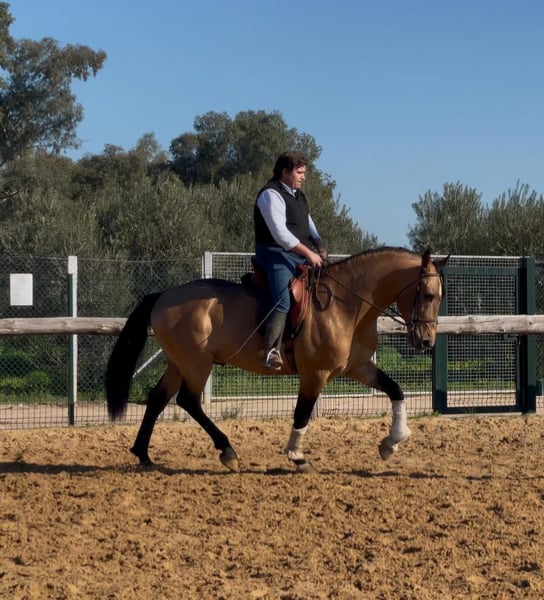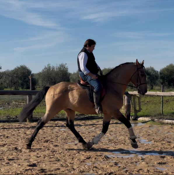 Dieser wunderschöne Falbhengst, ist harmonisch und korrekt gebaut, steht auf einem soliden Fundament. Der Hengst ist in den Grundgangarten geritten. War viel im Gelände und auch auf Ferias. Auf dem Platz arbeitet er immer gerne mit und lernt schnell. Dieser auffallende Hengst ist der passende Partner für tolle Ausritte und Arbeitseinheiten auf dem Platz - ob Dressur, Barrock oder Working Equitation. Das Pferd wird im Auftrag verkauft. Sie kann bei uns bin Beritt bleiben. AKU kann kurzfristig organisiert werden. Internationaler Transport.