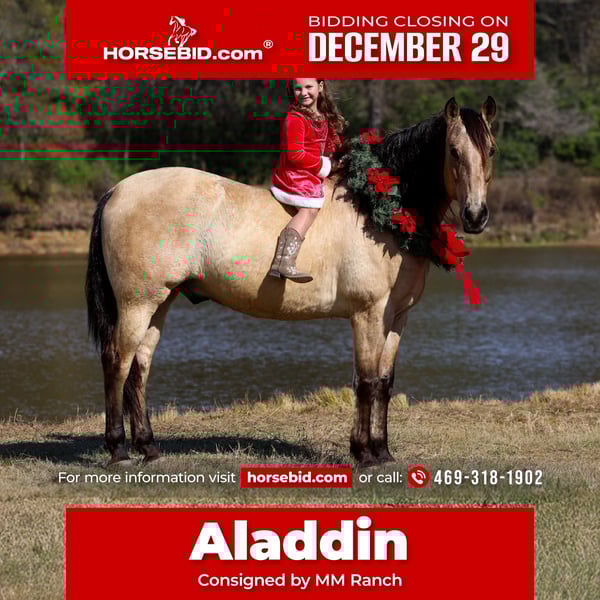 ⚜️ 𝓗𝓮𝓻𝓲𝓽𝓪𝓰𝓮 𝐖𝐢𝐧𝐭𝐞𝐫 𝓒𝓵𝓪𝓼𝓼𝓲𝓬⚜️ Happening now thru MONDAY | DECEMBER 29th - Available EXCLUSIVELY on HorseBid's website! For more details and to register visit: www.Horsebid.com CONSIGNOR CONTACT: MM Ranch 469-318-1902 LOCATION: Forney, TX BREED: Andalusian REGISTERED: Yes REGISTERED NAME: Caramelo 2016 COLOR: Buckskin HEIGHT: 15.3 AGE: 9 GENDER: Gelding 🦄Registered Half Andalusian Buckskin🦄 Meet Aladdin!!! A registered 9 year old buckskin gelding!!! Yes... a registered buckskin Andalusian that is just 9 years old!! This is one cool all around gelding!!! He’s got that color everyone loves. He is absolutely stunning. A big 15.3 hand tall stout made gelding. You don’t see Andalusians like this everyday. He is a classy, well broke, and smart horse. You can catch Aladdin in 100,000 acre pasture. He will walk right up to you. This is a kind good natured gelding. He will do anything you ask him to do. He has one of those willing to please type attitudes. He is always happy and ready to do whatever. He is so easy to handle and be around. Rides both English and western. He has all the fancy buttons in his training. He can go do anything you want him to do. He is such an elegant moving horse. Has had a lot of training. You could take him to the show pen or just use him for pleasure riding. He has had a lot of experience out on the trails. He will ride through any type of rough or rocky terrain. Been rode in the mountains. He requires no prep, just load up and go! He crosses water, bridges, he has been around exotic animals, goats, cows, mini ponies, seen all the sights. He will go out alone on trails too. Not at all Barn soured or buddy soured. Easy and fun to ride. Absolutely nothing brothers this horse. He is as laid back as they come. Up to date on vaccinations, coggins, worming, feet, teeth. He is ready to go to his new home. 🌎 We can help with making shipping arrangements. Feel free to call with any questions about him.