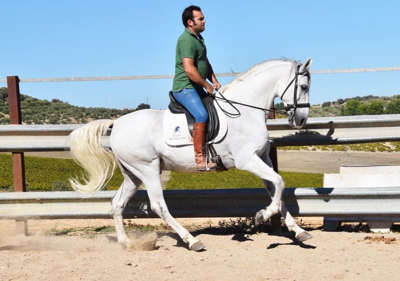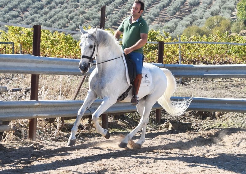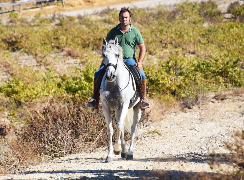 lieber Charakter, in den Grundgangarten geritten, hauptsächlich Gelände, Feria, Romería, Rocío, für schwächere Reiter geeignet www.elegante-andalusier.com