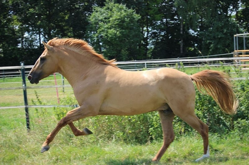 Absoluut droompaard: een Andalusiër in een prachtige kleur, hij lijkt meer op een Isabellafuchs. Zijn aanhankelijke karakter weet iedereen te charmeren. Hij is goed gereden in de dressuur, eenvoudige galopwissels en begint met zijgangen. Ook het rijden met een halsring hebben we al gestart. Hij kent het terrein zowel alleen als met anderen en toont zich tot nu toe nerveussterk, ook in het verkeer. In het trainingstraject voor rust en kalmte was hij een echte topper en was hij nergens bang voor. Hij beheerst diverse circustrucs zoals piaffe, liggen, compliment, zitten, nee zeggen en lachen. We zijn begonnen met apporteren. Favoriete truc: kusjes geven. Hij heeft ook al op shows gestaan en heeft eerste ervaringen met vuur opgedaan. Hij is tot nu toe nog nooit ziek geweest. Desalniettemin wordt hij niet verkocht aan beginners! Hij wordt alleen vanwege gezondheidsredenen door mij in betrouwbare handen overgedragen. Om recreatief rijden te ontmoedigen, rekenen wij bij bezichtiging/proefritten €35, deze wordt bij aankoop verrekend.