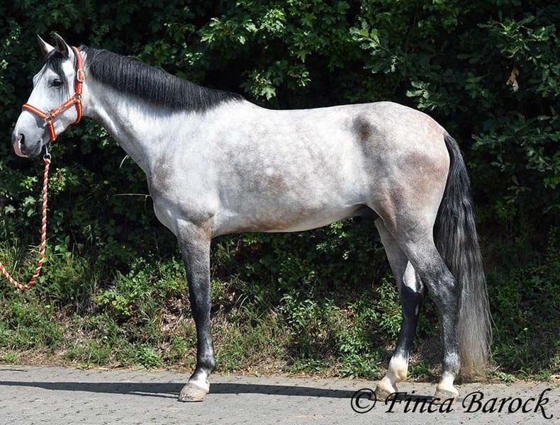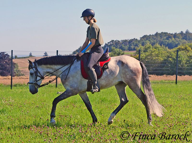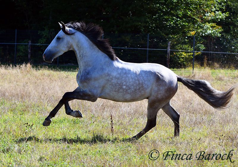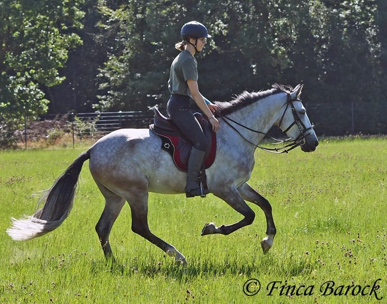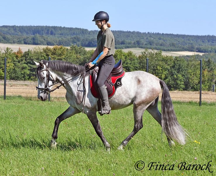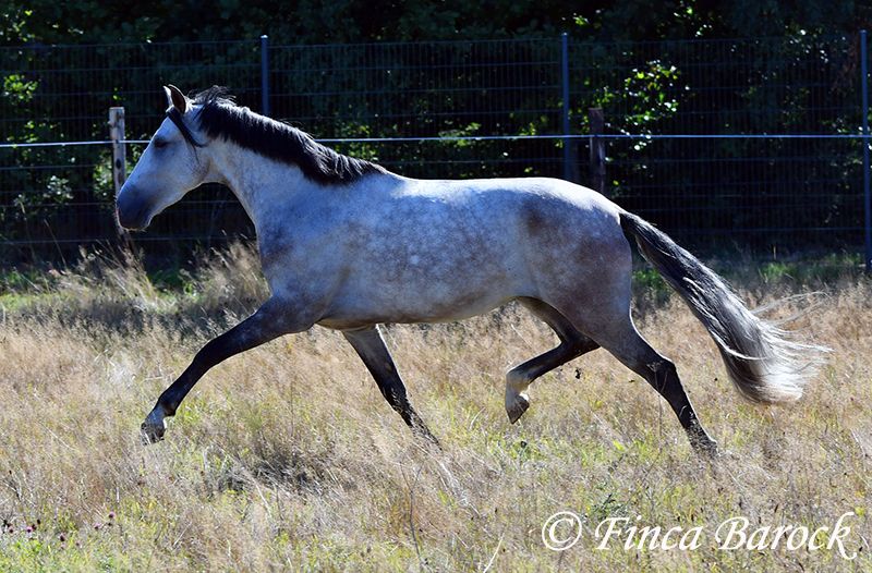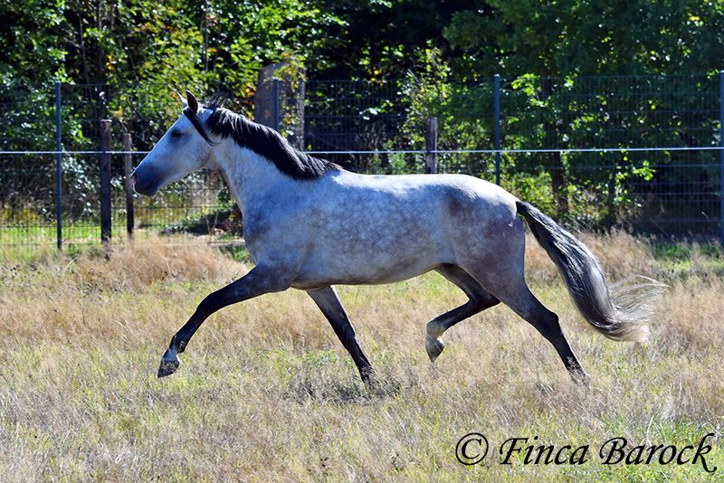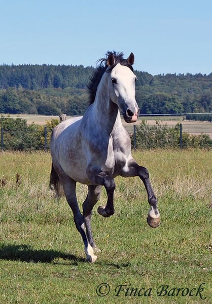 Breed: Andalusian Name: Morante Gender: Gelding Height: 158 cm Age: 01.04.2019 Color: Grey Price: €9,700 Sire: n/a Dam: n/a Morante, is our confident boy with a lot of trail experience and an incredibly cuddly, affectionate, and friendly character. He is already familiar with ferias and finds almost everything exciting and interesting in a curious way. He does not get easily disturbed by anything here with us. Morante is solidly trained in the basic gaits. His training in the arena is being further developed with us, and he is already familiar with many things in the field such as highways, cyclists, dogs, children, etc. Morante has also been ridden by less experienced riders and tries to respond well to aids that are unfamiliar to him. Overall, he is very patient and open-minded. He also shows a kind demeanor with children and teenagers. He has also been introduced to small jumps. Here he shows talent, is always eager, and could still be further developed in this area. In handling, he is a real treasure. He loves to cuddle with humans, cats, and dogs. He has also met small children and showed himself to be cautious and curious. With Morante, you get a horse that already has experience in the field and ferias, but has not had to work daily, making him fresh and unspoiled. In the herd, he is playful, open, and compatible with many different horses. He is currently turned out to pasture. Includes clinical veterinary examination and X-rays. Contact: Finca Barock, Tel. 0173-696 31 81, 56291 Wiebelsheim