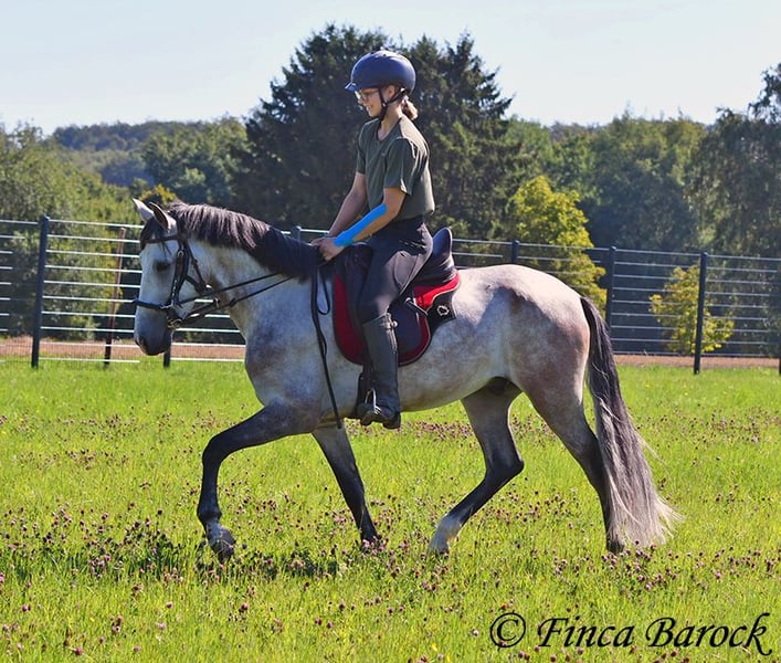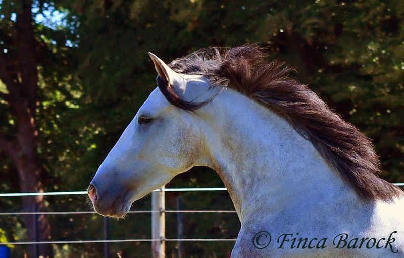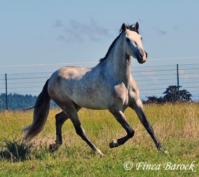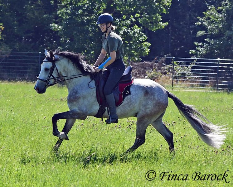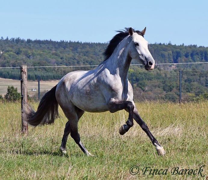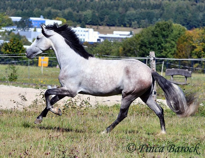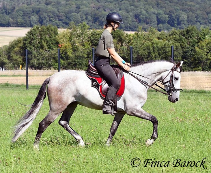 Breed: Andalusian Name: Morante Gender: Gelding Height: 158 cm Age: 01.04.2019 Color: Grey Price: €9,700 Sire: n/a Dam: n/a Morante, is our confident boy with a lot of trail experience and an incredibly cuddly, affectionate, and friendly character. He is already familiar with ferias and finds almost everything exciting and interesting in a curious way. He does not get easily disturbed by anything here with us. Morante is solidly trained in the basic gaits. His training in the arena is being further developed with us, and he is already familiar with many things in the field such as highways, cyclists, dogs, children, etc. Morante has also been ridden by less experienced riders and tries to respond well to aids that are unfamiliar to him. Overall, he is very patient and open-minded. He also shows a kind demeanor with children and teenagers. He has also been introduced to small jumps. Here he shows talent, is always eager, and could still be further developed in this area. In handling, he is a real treasure. He loves to cuddle with humans, cats, and dogs. He has also met small children and showed himself to be cautious and curious. With Morante, you get a horse that already has experience in the field and ferias, but has not had to work daily, making him fresh and unspoiled. In the herd, he is playful, open, and compatible with many different horses. He is currently turned out to pasture. Includes clinical veterinary examination and X-rays. Contact: Finca Barock, Tel. 0173-696 31 81, 56291 Wiebelsheim