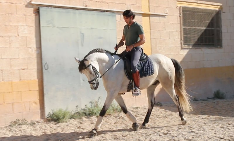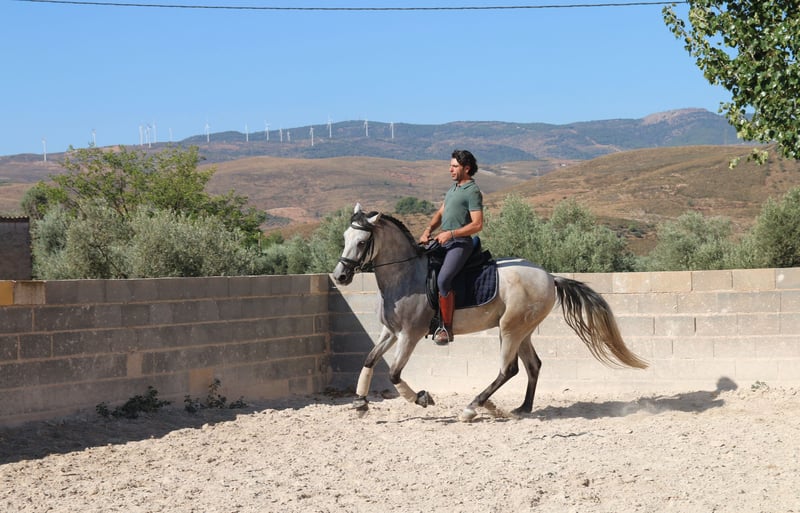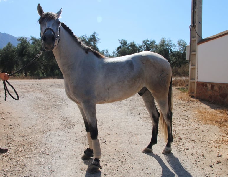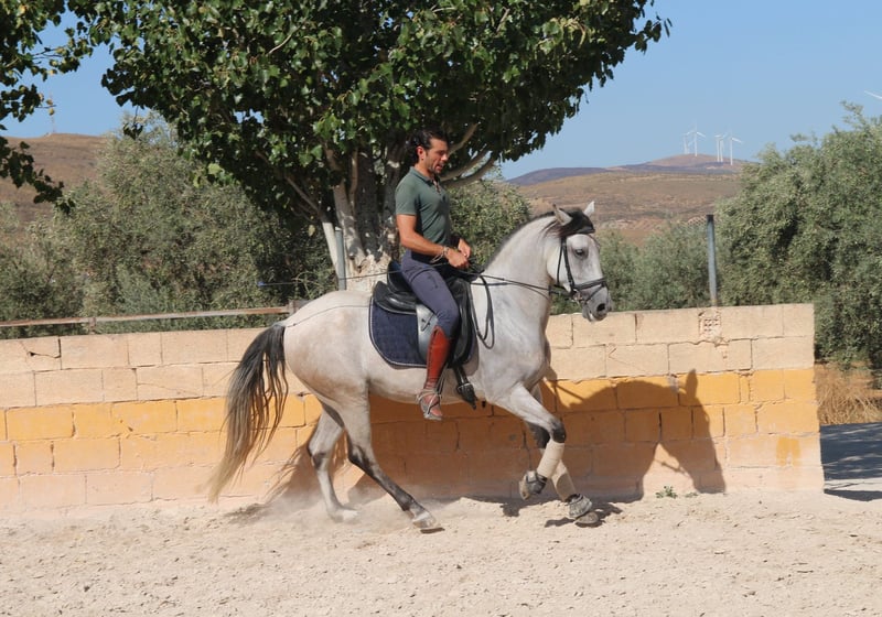 Chaleco is my charming Andalusian gelding, whom I purchased here three years ago. From the very first moment I met him, he enchanted me with his big heart and tireless curiosity. VIDEOS: Dressage: https://youtu.be/Lqp8J4i6DH4 Cross-country: https://youtu.be/0KeWjlmVudg Liberty/Free Dressage: https://youtu.be/A0-vZjVFF8M Chaleco’s natural curiosity and strong willingness to work are reflected in his dressage training. He is extremely eager to learn and always wants to be challenged. With his very sensitive mouth, he responds beautifully to light aids and has mastered the following exercises: Basic gaits (walk, trot, canter) Shoulder-in (walk, trot, canter) Shoulder-out (walk, trot, canter) Leg-yield (walk, trot, canter) Transitions walk > canter Transitions full halt > walk/trot/canter (and vice versa) Rein back Flying changes in canter Free jumping up to 1.20 m Jumping under saddle up to 1.00 m His movements are impressively elegant, he is very comfortable to sit, reacts to the finest aids, and combines strength with great motivation to work. Chaleco brings excellent quality that, with the right rider, makes him a very promising dressage horse. Currently, Chaleco has a 15-year-old part-lease rider who is just beginning to introduce him to jumping. He also hacks out alone, but only with experienced riders he feels safe with. Chaleco loves being around people and other horses and needs his daily share of cuddles. Especially in liberty dressage he shows himself to be a true natural talent. He not only masters free circling at walk and trot, but also recall training and waiting. He can already perform some small circus tricks such as the bow, “saying no,” and “smiling” with ease. At the moment, we are working on teaching him the Spanish walk. It is with a heavy heart that I am looking for a new, loving home for this wonderful young gelding, ideally in Germany. You are warmly invited to meet Chaleco in person, and I will gladly assist you with everything related to purchase, transport, and settling him into your stable. If you have any questions or are interested, please don’t hesitate to contact me.