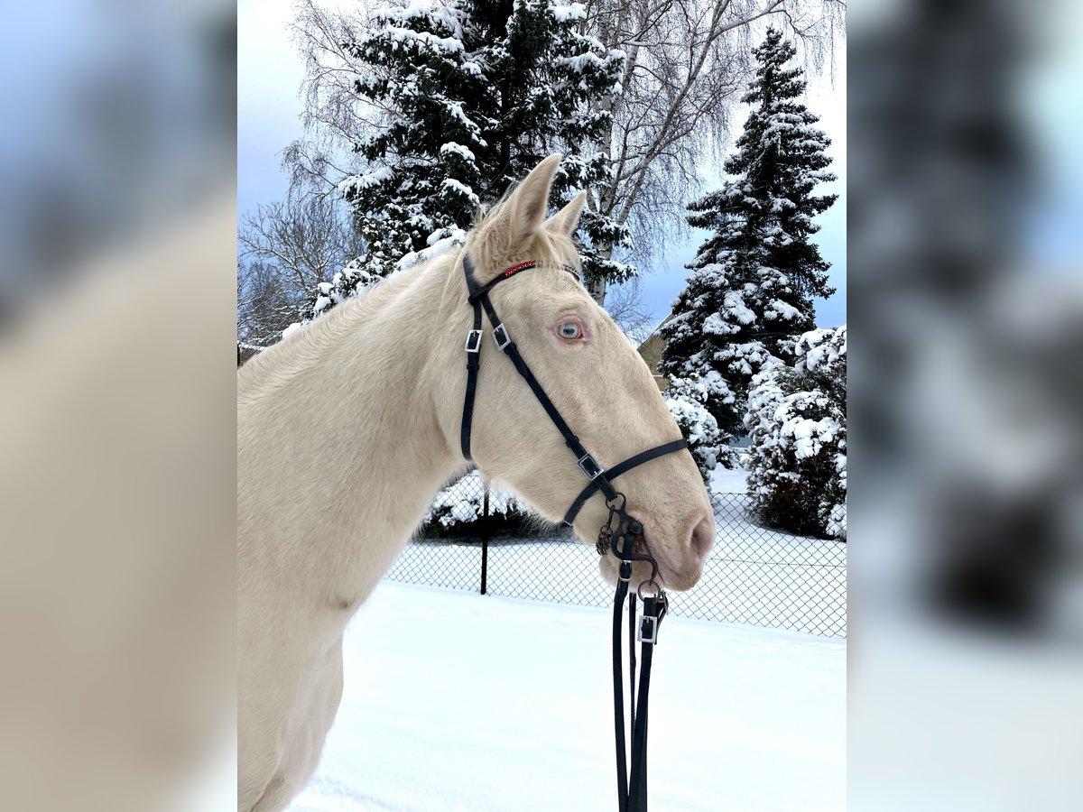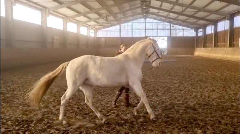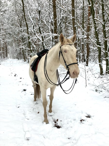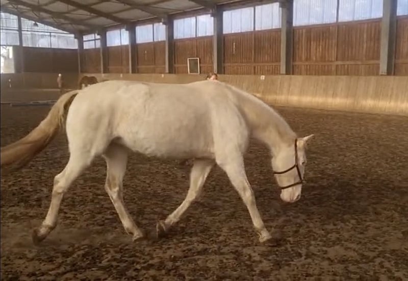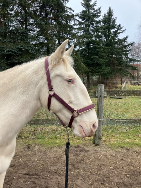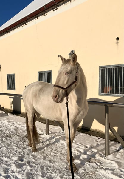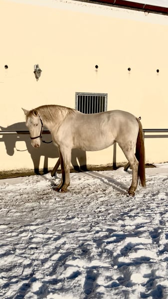Roya fällt gleich doppelt auf: Wegen ihres harmonischen, barocken Körperbaus mit außergewöhnlichem Ramskopf und wegen ihrer seltenen Perlino-Farbe mit kleinem Stern auf der Stirn und blauen Augen. Da sie nicht nur optisch, sondern auch charakterlich etwas Besonderes ist, sucht sie ihren Menschen - der sie so nimmt, wie sie ist, mit ihrem enormen Potenzial und ihren Special effects. Vorneweg: Cruzado, 1.62 m Stockmaß, im Januar 2026 11 Jahre alt geworden. Robust, sehr gute Hufqualität, schmiede - und verladefromm, nervenstark, geht entspannt allein ins Gelände. In der Reitbahn Seitengänge in Schritt und Trab. Steht in gemischter Herde, ranghoch. Sucht sich eine Stute als beste Freundin, die sie mitunter eifersüchtig bewacht. Nun zu den Special effects … als ich Roya kaufte (vor 3 Jahren) blockierte sie beim Reiten vollständig. Inzwischen lässt sie sich schön reiten, lässt sich eher treiben als zu rennen, fragt aber bei jedem neuen Reiter nach, ob er es wirklich ernst meint. Wenn sie jemanden nicht ernst nimmt, schaltet sie ab und wird extrem träge (hat man einmal die richtigen Knöpfe gefunden, ist Vorwärts kein Problem). Daher ist sie für meinen Reitunterricht leider nicht geeignet. Unter Druck (Turnier, Prüfungssituationen) blockiert sie ebenfalls und zieht sich in Langsamkeit zurück. Möglicherweise legt sich das, wenn sie ihren Menschen hat und mit Geduld an solche Situationen herangeführt wird - m.E. wurde sie beim Einreiten überfordert, weshalb sie anfangs häufig dissoziierte. Aktuell sehe ich sie eher als entspanntes Ausreitpferd, das auch mal in der Bahn arbeitet - mit ausschließlicher Dressurarbeit wird sie nicht glücklich. Handarbeit mag und kennt sie. Roya ist ein tolles Pferd - ich könnte sie mir in der WE vorstellen - aber sie braucht jemanden, der so viel Ego hat wie sie :) Kontakt bitte per WhatsApp / SMS. Danke! Kein Verkauf auf Raten, kein Zurverfügungstellen. Kein Probereiten beim ersten Besuch (sorry, sonst müsste ich auch damit anfangen, Geld zu nehmen fürs Korrekturreiten danach…)