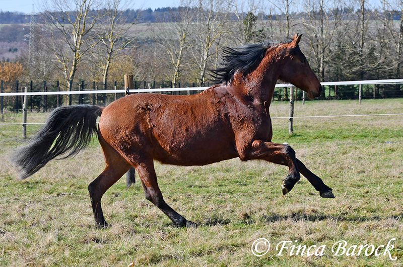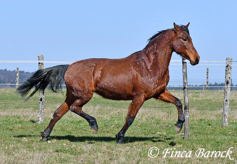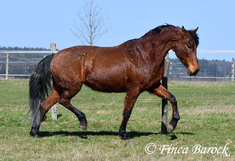 Rasse: Andalusier Name: Estrella Geschlecht: Stute Stockmaß: 158 cm Alter: 06.10.2012 Farbe: Braun Preis: 5000 € (zur Zeit) Vater: o. P. Mutter: o. P. Estrella, ist eine kompakte Stute mit wunderschönen Kopf und großen schwarzen Augen. Estrella war seit ihrem 2 Lebensjahr in einer Hand. Sie wurde vielseitig ausgebildet und kennt sehr viel. So ist sie in der Working Equitation sicher A geritten, L Angefangen. Sie kennt sehr viel Bodenarbeit, Arbeit an der Hand, Longe, Doppellonge und Freiarbeit. Sie geht an der Hand und unter dem Sattel Schulterherein, Travers, Renvers und Traverale. Estrella liebt Ausritte. Alleine kann Sie kurz nach fremden Sachen gucken, lässt sich hier aber souverän von Ihren Reiter überzeugen weiter zu gehen. Auch kennt Sie es das ein Handpferd mitgeht. Sie kennt ebenso das Reiten ohne Sattel oder auch mit Reitpad. Auch kleine Sprünge sind ihr nicht fremd. Grenfell kennt Sie die Arbeit mit Stangen (vom Boden und unter dem Reiter) und macht hier mit Freude mit. Unter dem Reiter zeigt Sie sich leichtrittig und reagiert zeitnah auf Reiterhilfen. Sie ist sehr sitzbequem und besonders ihre tolle Bergaufgaloppade ist hervorzuheben. Durch ihr feinfühliges Wesen braucht Estrella einen klaren Menschen. Hat Sie Ihren Menschen gefunden so geht Sie für diesen durch Dick und Dünn. Estrella hat MIM (PSSM2), Sie bekommt hier angepasstes Futter und ist damit gut eingestellt. Mit Estrella bekommt man ein erfahrendes Pferd mit vielseitiger Ausbildung, welche nur aus persönlichen Gründen zum Verkauf steht. Sie ist Herdenhaltung gewöhnt und kennt natürlich Gras. Estrella hat eine klinische Untersuchung. Kontakt: Finca Barock, Tel. 0173-696 31 81, 56291 Wiebelsheim