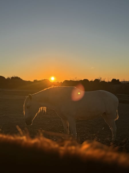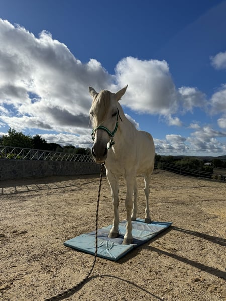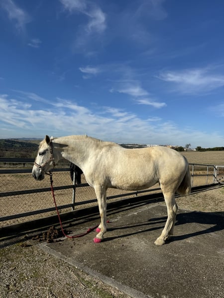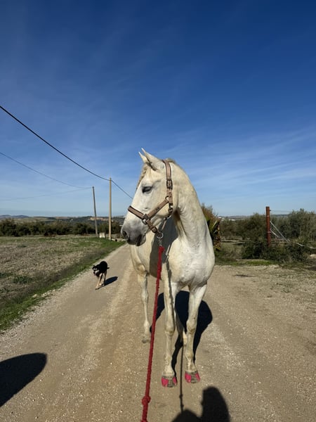 Traumpferd sucht neues Zuhause Melosa, eine etwa 1,65m große, 15 jährige Andalusier Stute, wie sie im Buche steht, ist genau das, was ihr Name sagt. Melosa bedeutet auf spanisch „sanft“, „lieblich“ oder „zärtlich“. Als ehemaliges Vaquero-Pferd ist sie sehr gut und fein geritten und braucht dadurch auch einen sehr feinen und sensiblen Menschen. Sie würde sich aufgrund ihres Gangwerks gut in der Dressur machen, aber auch für die working equitation, wie auch für die Freiarbeit ist sie absolut geeignet und hat sehr viel Freude daran. Sie sollte kein reines Ausreitpferd werden, da ihr das zu langweilig ist. Sie ist sehr intelligent und möchte gefördert werden. Melosa wäre sicherlich ein gutes Lehrpferd, wird aber nur an Menschen mit dem nötigen Feingefühl vermittelt, die gesunderhaltend ohne besondere Hilfsmittel arbeiten können. Im Umgang ist Melosa ebenfalls ein Traum. Sie kennt Hunde, Katzen, Traktoren, Kühe, Schafe, Hühner, war bereits in der Pferdestadt El Rocio und am Strand, lässt sich problemlos verladen und gibt alle Hufe. Sie lässt sich super longieren und mit Shanks, Snaffle oder am Halfter reiten und ist außerdem die perfekte Spaziergeh- oder Jogging-Begleitung. Wer spanische Pferde kennt, weiß, dass sie vor fast nichts Angst haben und mit ihrem Menschen durchs Feuer gehen. Genau so ein Pferd ist Melosa. Sie sollte aufgrund einer leichten Gelenkfehlstellung am Hinterbein eher auf härteren Böden stehen (keine matschigen Wiesen oder tiefe Sandpaddocks, aber auch kein reiner Asphalt). Aktuell steht sie in einer gemischten Herde auf einem Paddock mit Schotter- Sand- Gemisch, was ihre wirklich überdurchschnittlich guten Hufe auch problemlos mitmachen. Sie geht stundenweise auf die Wiese und ist ranghoch (zweite nach dem Chef), besitzt aber recht gute Führungsqualitäten. Melosa ist gesund, gut bemuskelt und klar im Kopf. Sie war gerade beim Zahnarzt und Chiropraktiker, sowie bei der Osteopathin. Sie wird ausschließlich in artgerechte Haltung mit Raufutter ad lib abgegeben, sowie einem Menschen, der gesunderhaltend mit seinem Pferd arbeiten kann (ohne Ausbinder, Sperrriemen, Rollkur, etc). Keine Boxenhaltung. Kein Notverkauf. Kein Anfängerpferd. Festpreis.