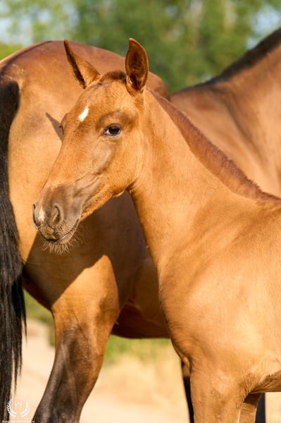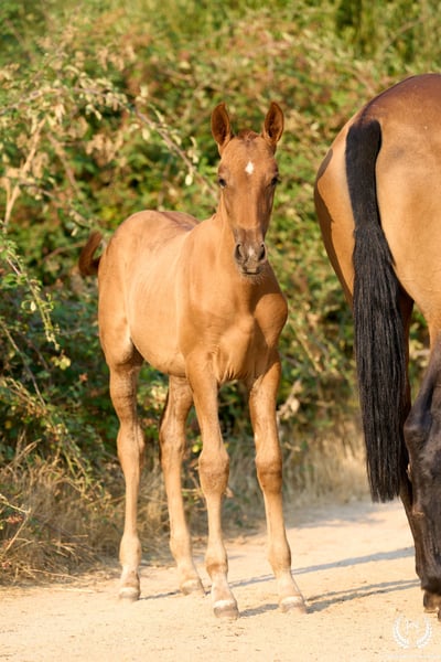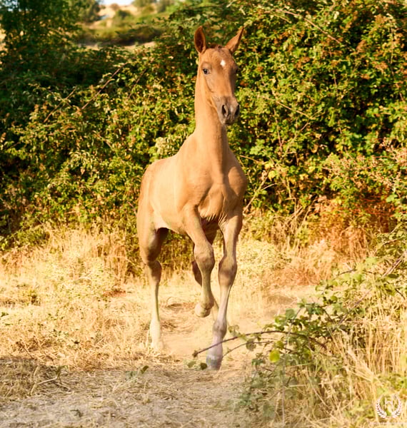 🏇 Ambar is an impressive Pura Raza Española (PRE) filly with a chestnut coat (ee), a white star on her forehead and another on the upper lip, with exceptional genetics. Registered with ANCCE, she is homozygous for the extension gene (ee), the well-known “little e”. Red mane and tail. 📆 Born on 27 May 2025 🧬 Outstanding PRE genetics: ♀️ Dam: Triana CCCXVI, a 1.70 m PRE mare, daughter of the great Deimos (1.80 m) from the prestigious Hnos. Tejedor Fdez. stud. Deimos is a grandson of Educado X (Hnos. Salvador Guardiola Fantoni), a Qualified, Improving and Elite Stallion, one of the most influential names in modern PRE breeding. ♂️ Sire: Pellon – Yeguada Militar “Pellon” is a black stallion born in 2016 at the Military Breeding Centre of Écija, standing 1.64 m tall. He stands out for his beauty, nobility and exceptional willingness to work, qualities he consistently passes on to his offspring. His genetics are impeccable: on the sire line he descends from Velero XI, one of the few stallions recognised by ANCCE as a Qualified Breeding Stallion and Young Recommended Breeder, a reference in sport; on the dam line he descends from Cepellon and Lego, as well as Lebrijano III and Bizarro XIV, some of the most important reproducers of the Yeguada Militar. Pellon has over 58 registered offspring, consistently producing elegant, functional and very expressive foals with top-level morphology and temperament. 🏆 Sporting potential and exceptional genetics: Ambar has everything to become an outstanding filly: impeccable breed morphology, convex profile and head, wide, functional and powerful movements, an exotic and highly valued coat, and a sweet, very easy temperament. Her pedigree guarantees quality and a strong future. 🩺 Health guaranteed: Any veterinary examination is accepted. Filly raised in freedom, perfectly socialised and well balanced within the herd. ✈️ National and international transport: We work with the best specialised equine transport companies. Request your quotation with no obligation.