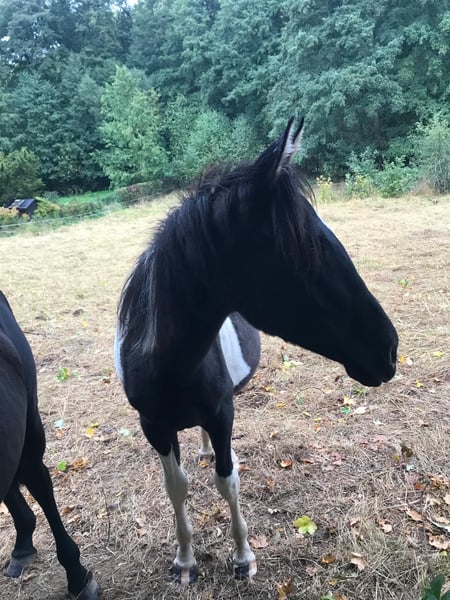 Verkaufe meine süße Jährlingsstute. Sie ist im Juni 2024 geboren und als Absetzer zu mir gekommen. Jedoch wird sie für mich zu groß werden (über 160 - 165, das schwarze Pferd auf Bild 1 ist 148 zum Vergleich). Sie kennt Hänger fahren, Tierarzt, wurde regelmäßig entwurmt und beprobt und geht alleine mit mir spazieren bzw als Handpferd mit. Sie ist bei der ANCADES als spanisches Sportpferd eingetragen und somit auch für die Zucht interessant. Die letzten Bilder zeigen die Eltern - der Papa ist ein Paint/ Lusitano Hengst. Die Mutter eine PRE