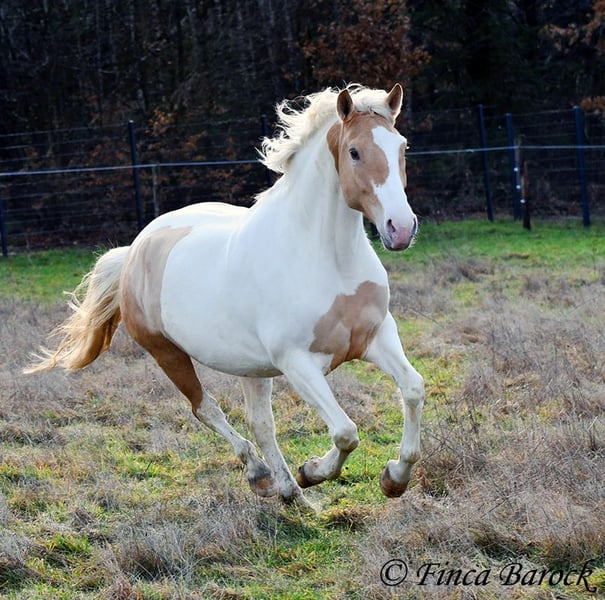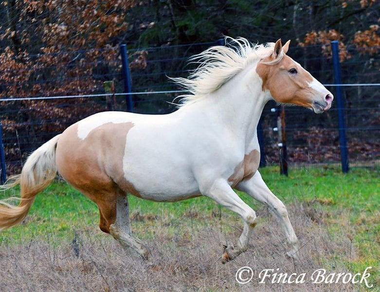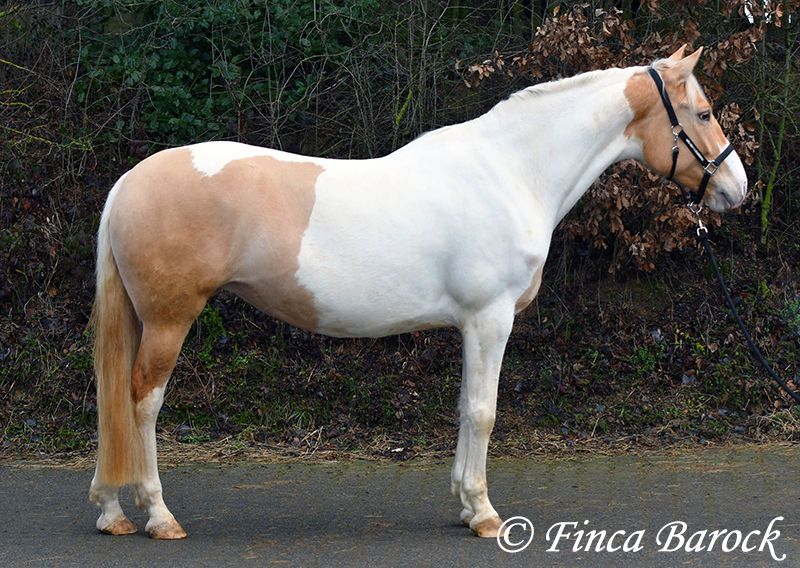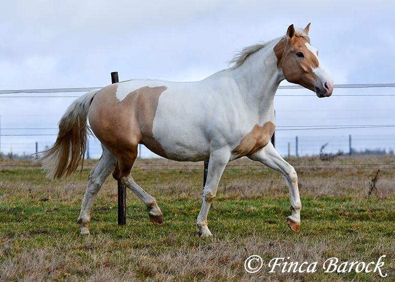 Race : Andalusian mix Name : Lokah Samastha Sexe : Jument Taille au garrot : environ 1,61 m Date de naissance : 04/02/2022 Couleur : Pie Prix : 8 500 € Père : inconnu Mère : Andalouse Lokah, est une jument robuste au pelage exceptionnel. Sa robe pie attire immédiatement l’attention. Elle est arrivée bébé, enceinte de sa mère, chez sa propriétaire. Elle a été élevée avec tendresse et a eu le temps de mûrir. Lokah est avec nous depuis trois mois pour son dressage et connaît désormais la marche en avant sous la selle. Elle est câline et curieuse. Progressivement, elle a fait la connaissance du cavalier. Sous la selle, elle se montre exemplaire. À pied, Lokah peut parfois remettre en question ses tâches (en gros : « Je suis là, c’est ennuyeux, pourquoi ne pas avancer de deux mètres ? »). Mais avec clarté et cohérence, elle comprend vite ses exercices et coopère volontiers. Elle a très bien réussi sa première sortie en extérieur à cheval. Elle est habituée à la vie en troupeau et connaît l’herbe. Une jeune, compacte demoiselle, encore au début de sa formation, avec toutes les portes ouvertes. Son cadre compact lui permet également de porter des cavaliers plus grands avec aisance. Vidéo en liberté : https://youtu.be/XLSbKj85pq0?si=bCTgMNRNhYripONt Contact : Finca Barock, tél. 0173-696 31 81, 56291 Wiebelsheim
