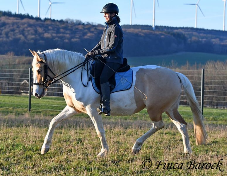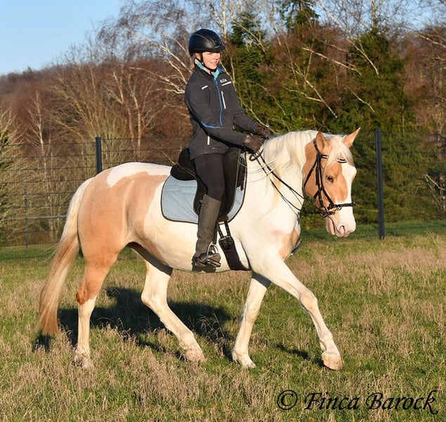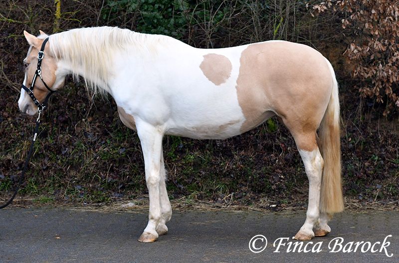 Rasse: Andalusiermix Name: Lokah Samastha Geschlecht: Stute Stockmaß: zz ca. 161 cm Alter: 04.02.2022 Farbe: Falbschecke Preis: 8500 € Vater: unbekannt Mutter: Andalusier Lokah, ist eine kräftige Stute in Sonderlackierung. Mit ihrer Farbe fällt Sie sofort ins Auge. Sie kam als Baby im Bauch mit ihrer Mama zu ihrer Besitzerin. Sie ist liebevoll aufgewachsen und hat Zeit zum Reifen bekommen. Lokah ist seit 3 Monaten bei uns zur Ausbildung und kennt mittlerweile die GGA unter dem Sattel. Sie ist verschmust und aufgeschlossen. Stück für Stück hat sie bei uns den Reiter kennengelernt. Unter dem Reiter zeigt sie sich als Musterschülerin. Am Boden kann Lokah ihre Aufgaben durchaus mal hinterfragen. (Frei nach dem Motto - Hier stehen ist doof, wir könnten doch noch 2 Meter weiter gehen?) Wenn man ihr hier mit Klarheit und Konsequenz begegnet, versteht sie die Aufgaben schnell und macht gut mit. Einen ersten Ausflug ins Gelände unter dem Reiter hat sie sehr gut gemeistert. Sie ist Herdenhaltung gewöhnt und kennt Gras. Eine junge, kompakte Lady am Anfang Ihrer Ausbildung der noch alle Wege offen stehen. Durch ihren kompakten Rahmen deckt Sie auch größere Reiter sehr gut ab. Freilaufvideo: https://youtu.be/XLSbKj85pq0?si=bCTgMNRNhYripONt Kontakt: Finca Barock, Tel. 0173-696 31 81, 56291 Wiebelsheim