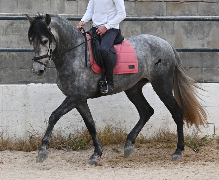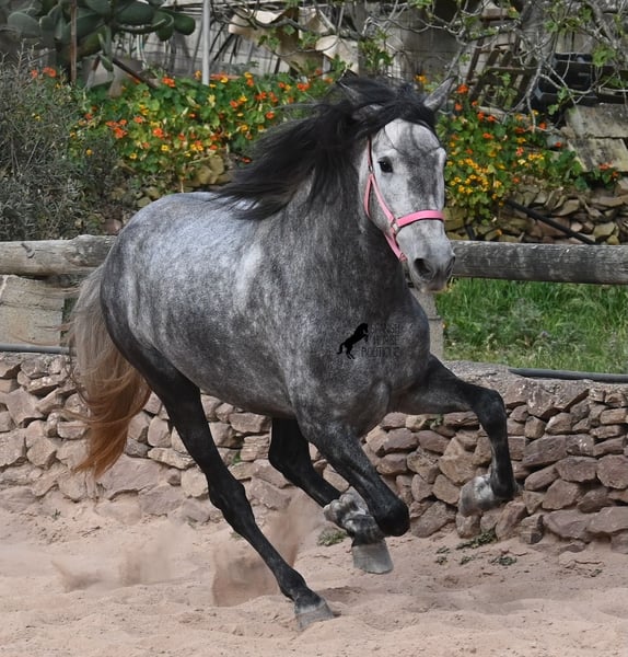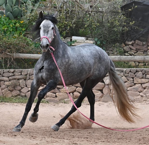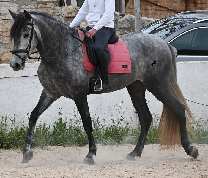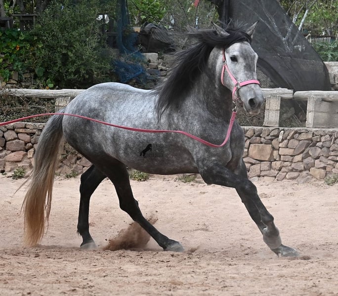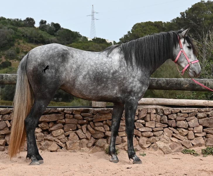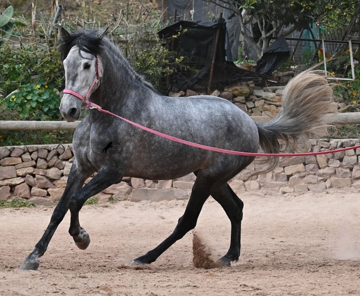 Este caballo, que ya mide impresionantes 170 cm, es un pura raza PRE de 2022 (Andaluz con certificación de raza de la ANCCE) y está registrado como yegua. Sin embargo, lo que en un principio parecía un milagro de la naturaleza, resultó ser que también cuenta con estructuras genitales masculinas. En lenguaje coloquial, se le podría llamar hermafrodita, lo cual puede parecerte sorprendente al leer esto, pero en realidad, este ser especial ha sido creado así por la naturaleza. :) Originalmente, se planeaba criar con él, pero esto ya no es posible, ya que no entra en celo y su condición doble-sexual no permite compararlo con otros caballos en cuanto a su equilibrio hormonal. Por ello, buscamos un lugar de vida para este caballo, a un precio muy reducido. Actualmente, el caballo está siendo montado y conoce el peso del jinete en paso y trote sin riendas largas (aún se trabaja en la coordinación para el galope). Es importante señalar que, en cuanto a convivencia en manada, esto es solo parcialmente posible: los caballos machos pueden reaccionar hormonalmente al caballo, y la parte masculina del animal suele mostrar un comportamiento orgulloso y masculino. También reacciona a las yeguas, por lo que solo sería posible mantenerlo en un potro castrado, aunque esto debería probarse. Por ahora, la convivencia en box y sin problemas, tanto con caballos stallion como con yeguas en el establo. Probablemente, esta sea la mejor opción para su alojamiento, en box o paddock, para asegurar que ambas partes en el caballo puedan vivir en armonía. Una "castración química" probablemente no sería efectiva, ya que su equilibrio hormonal funciona de manera diferente. Además, no hay testículos para una castración quirúrgica. Se trata de un caballo muy especial, con carácter vivo, que se está desarrollando bien como caballo de montar y además es muy elegante, ¡todo por un precio muy asequible! Su ubicación es Menorca. Con gusto puedo organizar una revisión veterinaria en el lugar, transporte o incluso su viaje, si desea visitarlo personalmente. Para más detalles, puede consultar mi página o contactarme directamente. Saludos desde España
