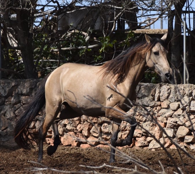 Born in 2019, this dun mare is a real raw jewel. Translated, the golden child's name means "chamomile" and she also has a very calming charisma. Although she is completely raw, she opens up within a few minutes and enjoys being cuddled and handled. She then follows you even when the herd moves in a different direction. With this people-friendly, open character, it will certainly be easy to break her in. Of course, there is also the option of organizing a ride on site. As it had rained heavily the day before, the ground was a little slippery, but she still moved beautifully and went over the rocks in the paddock like a chamois. In the herd, she is of medium to low rank and due to the 24-hour robustness, she is well socialized, resistant and well tied up, thanks to the stony ground. I estimate her final height to be 157cm, as it was not possible to measure her freely. She is currently in Mallorca! Videos and photos of the equine passport are available on request. I would be happy to organize an AKU, riding, transport or even your trip if you come to see her in person. Details can be found on my website or in conversation. Location