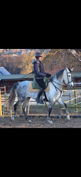 Wir verkaufen eine bildhübsche Andalusierstute. Tormenta ist 8 Jahre alt und hat eine Größe von 1,60m. Sie ist sehr rittig ob im Gelände oder auf dem Platz. Tormenta ist eine Stute die jedem gefallen möchte unter dem Sattel und das zeigt sie auch. Wir haben angefangen mit ihr Seitengänge zu reiten was sie sehr schnell lernt. Sie ist am Anfang ihrer reiterlichen Karriere und ich denke sie passt gut in die working ecquitation aber auch als gehobenes Freizeitpferd. Tormenta lebt bei uns im Offenstall in einer gemischten Herde. Wenn sie euer Interesse geweckt hat dann schreibt mir oder ruft einfach an 0163 9840641 da kann ich alle weiteren Fragen beantworten