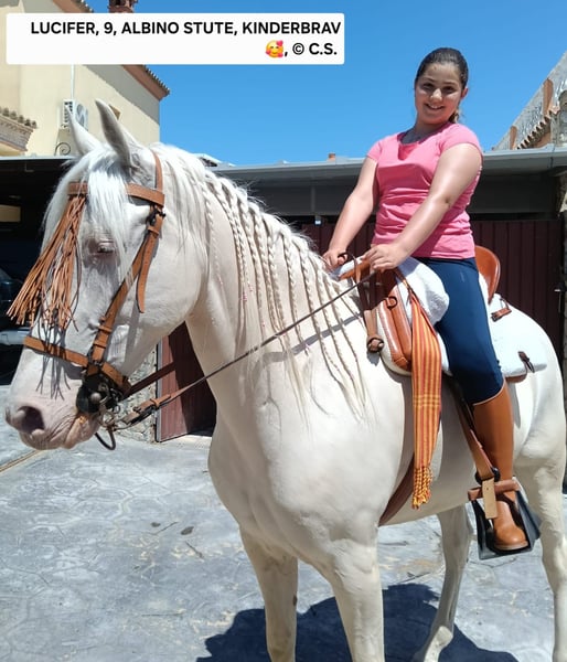 LUCIFER ...No idea who came up with this name for such a magnificent mare... 🤔 This Cremello lady with the special coat color ALBINA is 8 years old and will turn 9 in May. She stands approximately 15.5 to 15.8 hands. Very well-behaved and ridden by young riders everywhere—out in the fields, at fairs, and during festivals. In handling, she is very affectionate, well-trained, and easy to manage. She loads into the trailer and stable without issues. This is a fantastic opportunity to acquire a true gem at an affordable price 👌 Contact us via WhatsApp at 0034 670 097 903! Your Carmen
