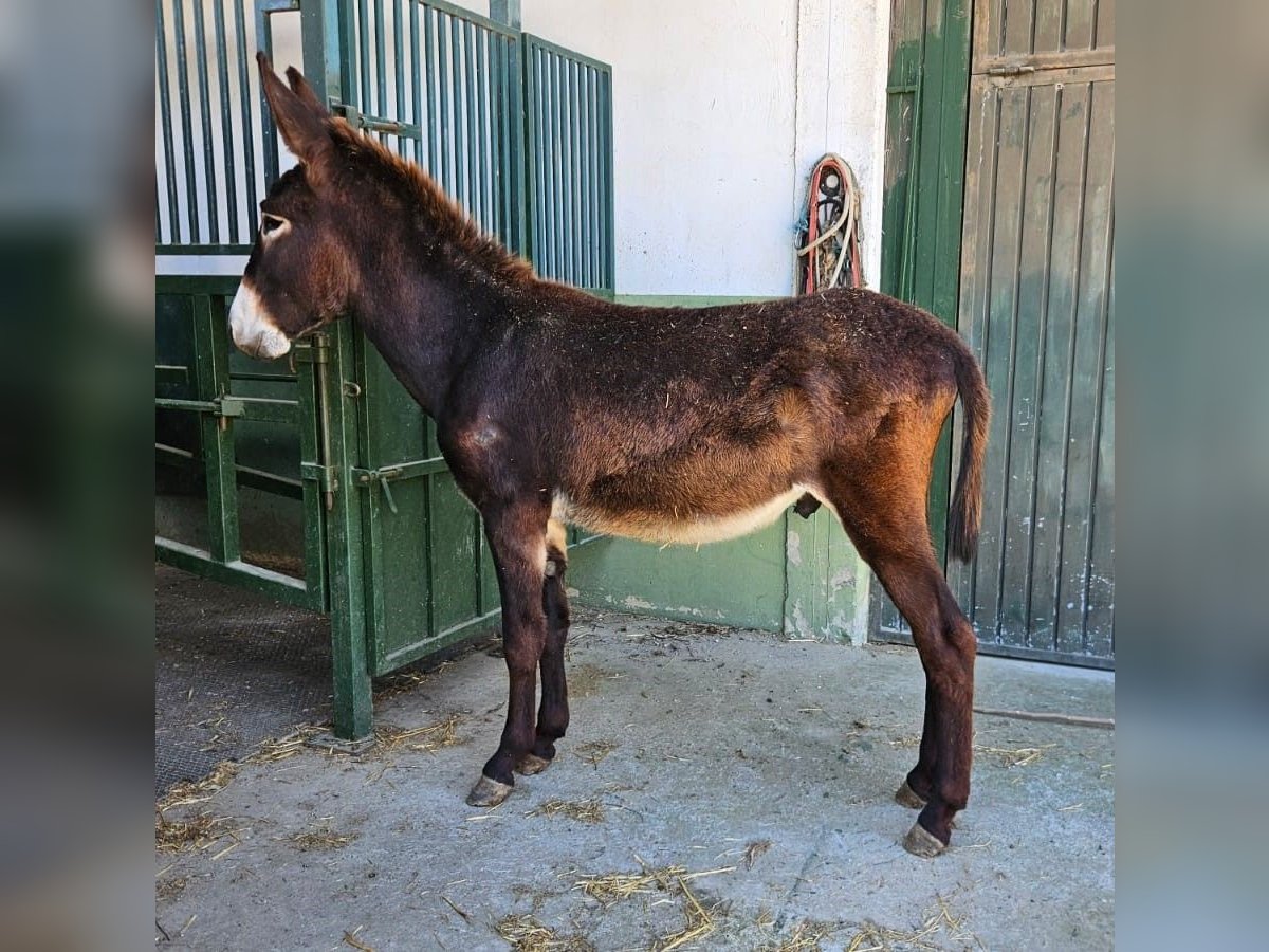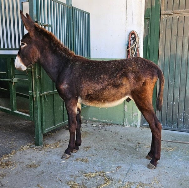 Catalan donkey Introducing a charming and promising young stallion donkey, born in 2024. This striking black donkey stands at a height of 144 cm, making him an ideal size for various riding and breeding purposes. His well-bred lineage ensures excellent qualities for future generations and reliable temperament. This well-bred stallion displays a strong, healthy build with a sleek, shiny coat that highlights his fine conformation. His confident stance and alert expression reflect his good health and vitality. age: 31082024
