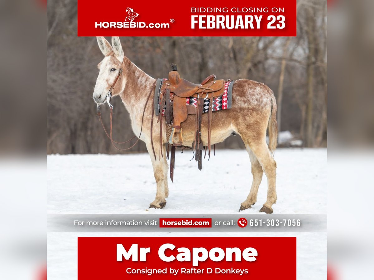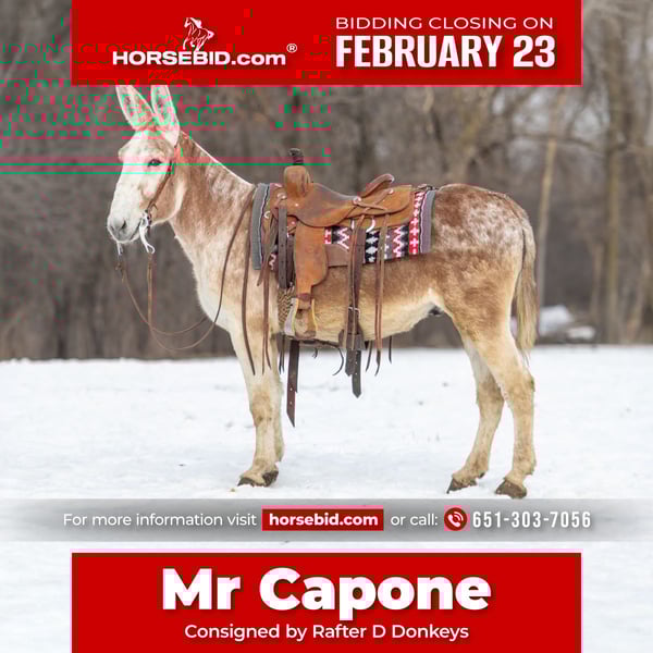 💎 𝐓𝐇𝐄 𝓓𝓲𝓪𝓶𝓸𝓷𝓭 𝐒𝐇𝐎𝐖𝐂𝐀𝐒𝐄 💎 Happening now thru MONDAY | FEBRUARY 23rd - Available EXCLUSIVELY on HorseBid's website! For more details and to register visit: www.Horsebid.com CONSIGNOR CONTACT: Rafter D Donkeys 651-303-7056 LOCATION: Hastings, MN BREED: Donkey REGISTERED: No REGISTERED NAME: Mr Capone COLOR: Red Roan HEIGHT: 58 inches AGE: 10 GENDER: Gelding The most incredible little gelding donkey that you will find is our Mr Capone! He is the absolute coolest donkey I have ever been around, from his personality to his cool ride. He is safe for anyone, from your 18-month-old baby to your 80-year-old grandma! Mr Capone is finished under saddle and even rides English. He was shown in driving classes as a 2 and 3 year old, but hasn't been driven much since. He has been shown a lot in the 4H walk-trot western pleasure classes where he excelled! This donkey will absolutely steal your heart, without a doubt. Mr. Capone is seasoned on the trails where he has no problem crossing logs or water. He is also happy to ride out alone or with the group. He rides as well inside as he does outside. He is used to going through the obstacles such as the bridge or playing with the ball, he will even carry a flag! Mr Capone stands quietly to be groomed and tacked, he bridles easily and loves to have his ears rubbed. He is seasoned, safe, and very much in the prime of his life. He also loads easily and hauls well. Mr. Capone is not a racehorse by any means and has no desire to take you anywhere fast; but he is the utmost pleasure to ride and enjoyable to be around. Mr Capone is easy to catch, does well stalled or pastured. He gets along well with pasture mates and is an overall easy keeper. Mr Capone even does well with small animals. He will put his nose all the way to the ground to make a new friend with any little dog. He is an absolute honest gentleman no matter what you are asking of him. We lightly jumped him under English tack but have mostly ridden him in western tack. He is perfect in a walk or trot. He keeps his head low just like a western pleasure horse is trained to. We think the absolute world of this donkey and know that whoever gets him will adore everything about him. He has the most loyal heart of gold! If you have any questions or would like to meet Mr Capone prior to the auction ending please contact Dillon at 651-303-7056.