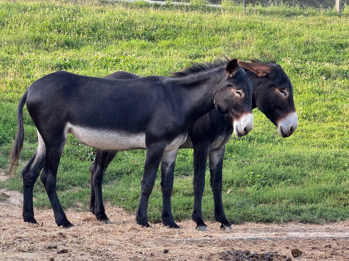 For reasons of age, we are now reducing our stock of excellent large donkey breeding mares. While the older animals continue to enjoy their well-deserved retirement with us, the younger ones prefer to seek a new home. Today, I would like to introduce you to the following mare: Lumière Loreley This versatile and extremely lovable large donkey mare can only be sold together with her friend Lioba Loreley. It would be heartless to separate them. Please continue reading the text about the large donkey mare "Lioba Loreley." Like all the other mares, both are well-mannered, gentle, people-oriented, and affectionate. Their hooves have been cared for throughout their lives from day one, and they have been regularly dewormed in spring and autumn with Ivermectin or Moxidectin in rotation. They have never experienced any harm from humans. They have experience with people visiting them in the pastures, with individuals with disabilities who spend many hours with them, and with groups that come for coaching. They go on hikes and much more. Our donkeys live as a herd on pastures that are many hectares large, have food available at all times, do not get overweight, are well-socialized, and of course, are in excellent health. Since they live freely 360/24, they are alert and attentive, smart and motivated, and always look forward to contact with humans. Therefore, they are suitable for any use such as driving, hiking, riding for light individuals, and therapeutic use in emotional and social areas. Lioba and Lumière can only go together and only to a donkey-appropriate home.