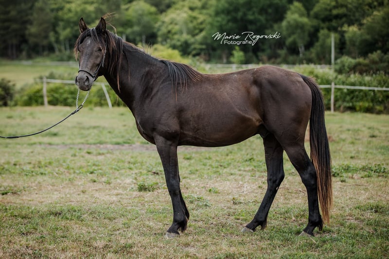 Anglo-Arabian, AES papers ledger (+ IFCE registration), Smoky-black (heterozygous cream gene) born on June 26, 2020 today (4 yrs.) approx. 153 cm, 154-156 cm final height. great sport horse prospect, versatility ... stable, compact appearance. Moves well, grew up in herd outside in foal group, good with halter, lead rope, barehoof care, loading, traveling. Basic training ground work. Not stubborn - lives at stud 24/7 outside in larger stallion group with old stallion. Barehoofed, dewormed, vaccinated. Beautiful appearance, also suitable for smaller riders. Photo gallery: 2024 - 2022 - 2021 - 2020. Very interesting in terms of breeding: correct lines, sire one of the very few thoroughbreds in the world in the color Smoky-Cream (double lightened black), dam from the Champagne breeding line of Falkenhorst Stud (Gwendolyn Gregorio). Sire and grandsire can also be viewed at the stud. Very favorable due to reduction of our stock. Due to the death of the breeder an absolute \"limited edition GG\" Offer. Private sale without warranty, guarantee or return. Personal collection absolutely preferred, accommodation available free of charge.