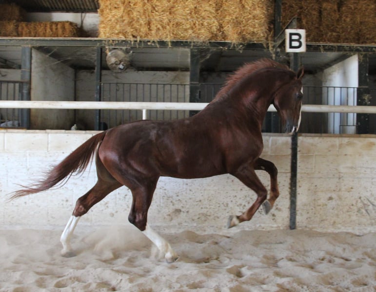 Tabasco est un magnifique Anglo-Arabe avec pedigree. Monté en Doma Vaquera, son père est champion d'Espagne en Doma Vaquera. Il peut également se montrer en dressage classique avec ses trois belles allures. Tabasco est un étalon très sociable, clair d'esprit, proche de l'humain, et également obéissant et attentif sous la selle. Il se déplace sans problème en terrain varié, seul ou en groupe. Un contrôle vétérinaire approfondi (AKU) peut être organisé. Le transport sera organisé à l'international. Vidéos sur demande.