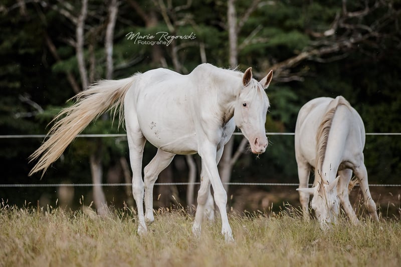 Anglo-Araber-Stute | geb. 2020 | Endmaß ca. 165 cm erwartet Genetik: W19, W20, Frame Overo (OLW) | n/P2, n/P4 SHE`s ALL WHITE ist eine genetische Besonderheit: Sie trägt gleich drei dominante Weißmuster ? W19, W20 und Frame Overo (OLW) - und wurde nahezu vollständig weiß geboren. Die genetische Grundfarbe ist nicht bekannt, ihre Erscheinung jedoch spektakulär. Sie zählt zu den wenigen bekannten vollständig weißen Anglo-Arabern weltweit. Ihr Vater ist leistungsgeprüft und gekört, ihre Mutter bringt Typ und Format aus bewährter Anglo-Araber-Zucht mit. Der Vollbruder von 2018 hat sich auf etwa 165 cm entwickelt - ein ähnliches Endmaß wird auch bei ihr erwartet. Mit ihrer seltenen genetischen Kombination ist sie interessant für farborientierte Zuchtprogramme - sowohl im Anglo-Araber-Bereich als auch bei Warmblütern mit Araberblutanteil. Farblich ist sie besonders wertvoll für die Vererbung von White Spotting-Varianten, inklusive Frame Overo. Sie ist eine sensible, eher zurückhaltende Stute, die neugierig auf den Menschen reagiert, jedoch Zeit und Feingefühl braucht, um Vertrauen zu fassen. Im Umgang zeigt sie sich aufmerksam und intelligent.