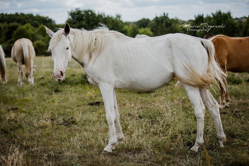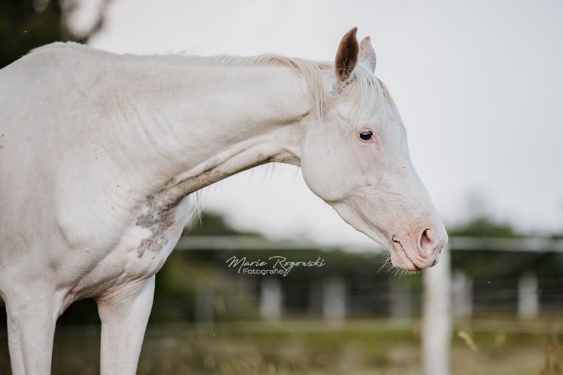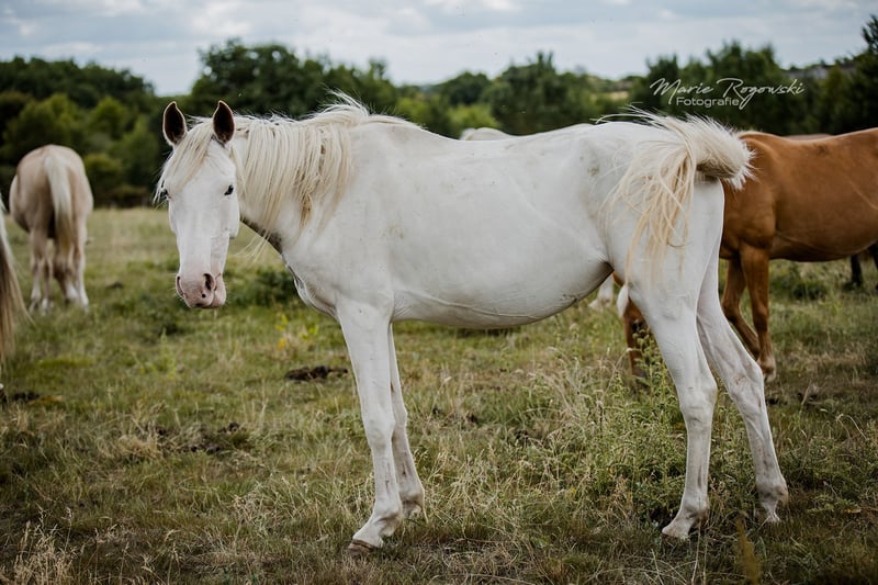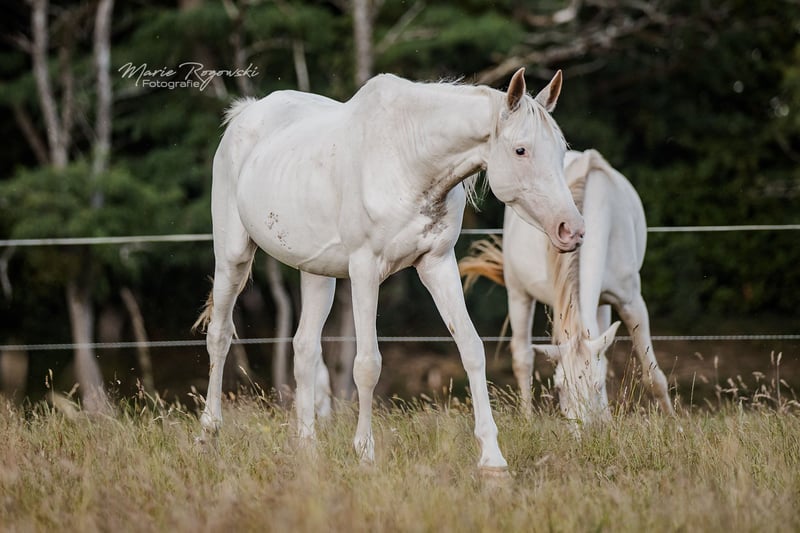 Anglo-Araber-Stute | geb. 2020 | Endmaß ca. 165 cm erwartet Genetik: W19, W20, Frame Overo (OLW) | n/P2, n/P4 SHE`s ALL WHITE ist eine genetische Besonderheit: Sie trägt gleich drei dominante Weißmuster ? W19, W20 und Frame Overo (OLW) - und wurde nahezu vollständig weiß geboren. Die genetische Grundfarbe ist nicht bekannt, ihre Erscheinung jedoch spektakulär. Sie zählt zu den wenigen bekannten vollständig weißen Anglo-Arabern weltweit. Ihr Vater ist leistungsgeprüft und gekört, ihre Mutter bringt Typ und Format aus bewährter Anglo-Araber-Zucht mit. Der Vollbruder von 2018 hat sich auf etwa 165 cm entwickelt - ein ähnliches Endmaß wird auch bei ihr erwartet. Mit ihrer seltenen genetischen Kombination ist sie interessant für farborientierte Zuchtprogramme - sowohl im Anglo-Araber-Bereich als auch bei Warmblütern mit Araberblutanteil. Farblich ist sie besonders wertvoll für die Vererbung von White Spotting-Varianten, inklusive Frame Overo. Sie ist eine sensible, eher zurückhaltende Stute, die neugierig auf den Menschen reagiert, jedoch Zeit und Feingefühl braucht, um Vertrauen zu fassen. Im Umgang zeigt sie sich aufmerksam und intelligent.