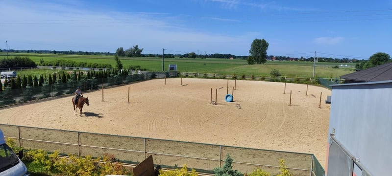 Te koop aanbod van een manege in Szydłowice Te koop staat een modern manegecomplex gelegen in het schilderachtige dorp Szydłowice, op 40 km van Wrocław (dichtbij de A4 snelweg) in Polen. Het complex, gebouwd tussen 2015 en 2024, biedt uitstekende omstandigheden voor zowel paarden als hun eigenaars. Momenteel wordt het terrein gebruikt voor sport- en fokactiviteiten, geregistreerd bij de Westfaalse vereniging. Er is de mogelijkheid om het geheel inclusief sport- en fokpaarden te verkopen (VERKOOP VAN PAARDEN IS ALLEEN MOGELIJK ALS GEHEEL COMPLEX). Daarnaast bestaat de optie om het terrein voor een langere periode te huren. Omschrijving van het complex: - Stal 1 (gebouwd in 2015) - 10 boxen (3,8 m x 3,5 m) - Wasplaats - Keuken - Zadelkamer - Sociálruimte - Opslagruimte (80 m²) - Hooi- en stroopslag: circa 100-150 balen - Stal 2 (gebouwd in 2020) - 8 boxen (3,8 m x 3,5 m) - Wasplaats - Zadelkamer - Opslagruimte met silo (15 m³) - Stal 3 (gebouwd in 2022) - 2 boxen (3,8 m x 3,5 m) - 2 veulenkamers (7,6 m x 3,5 m) Paardeninfrastructuur: - Overdekte rijhal (gebouwd in 2020): 48 m x 23 m, voorzien van een nieuw kwartsbodem (2023) met automatische ondergrondse bewatering - Buitenrijbaan: 52 m x 34 m met kwartsbodem - Overdekte ronde bak voor 4 paarden, gemetseld en met rubberen vloer - Paardenlongier, gemetseld en overdekt met kwartsbodem - Overdekte hooischuur (gebouwd in 2024): 30 m x 12 m, hoogte 7 m, capaciteit voor 600-800 balen - Mestbult (2024): 20 m x 9 m Percelen: - 8 hectare weiland en weidegrond met bebouwing - Perceel voor de bouw van een vrijstaande woning van 0,244 hectare Aanvullende faciliteiten: - Vrijstaande gemetselde stal voor ongeveer 12 paarden - Zomerstal van hout en metselwerk op de weide - Woonruimte: Twee volledig ingerichte appartementen van 18 m² en 47 m², ideaal voor eigenaren of personeel - Op perceel nr. 544 is verdere uitbreiding van agrarische gebouwen mogelijk Voor meer informatie in het Engels of Duits, neem contact op via telefoon: PL +48 695 087 966, ENG: +48 695 087 966