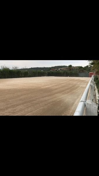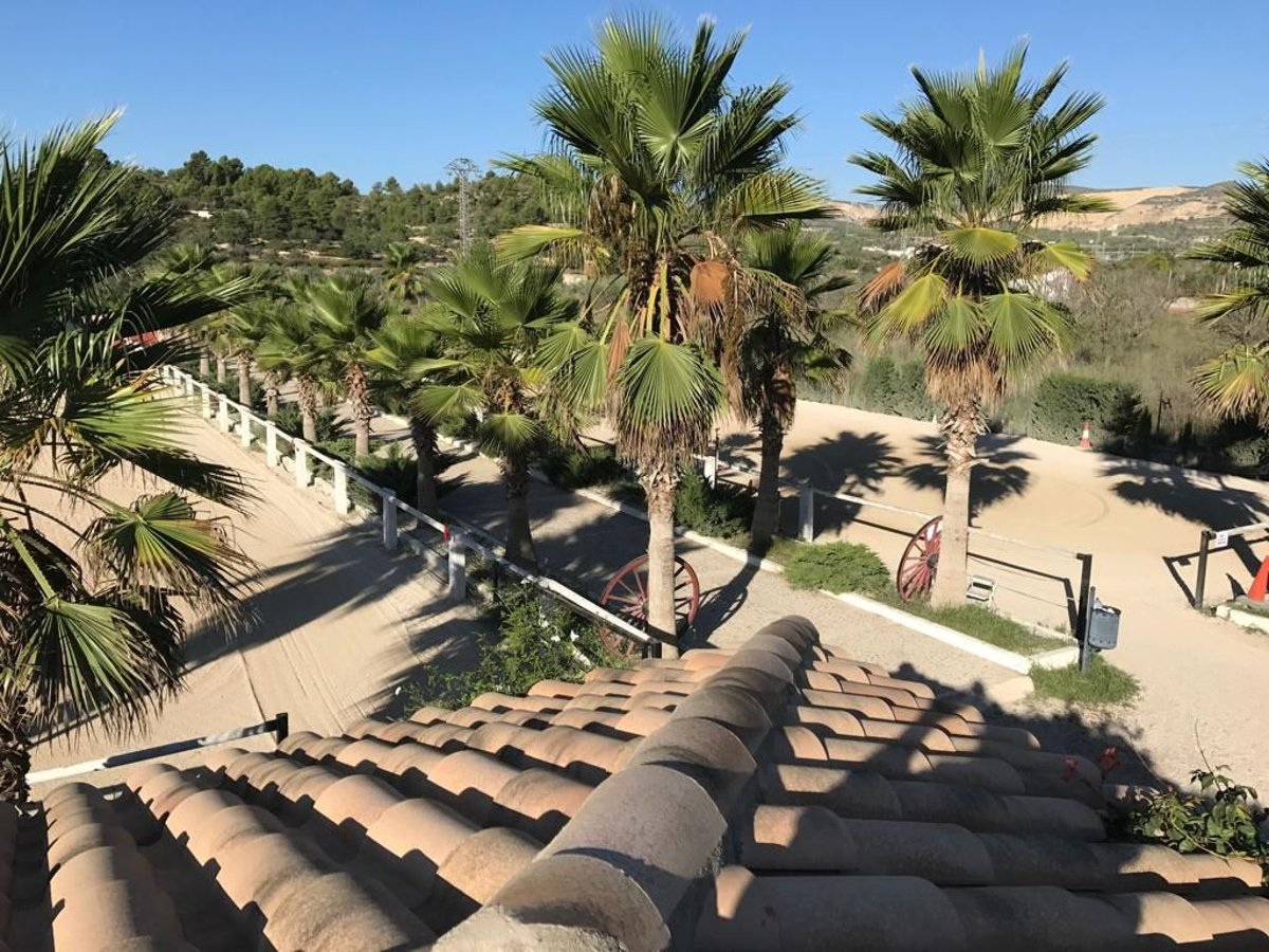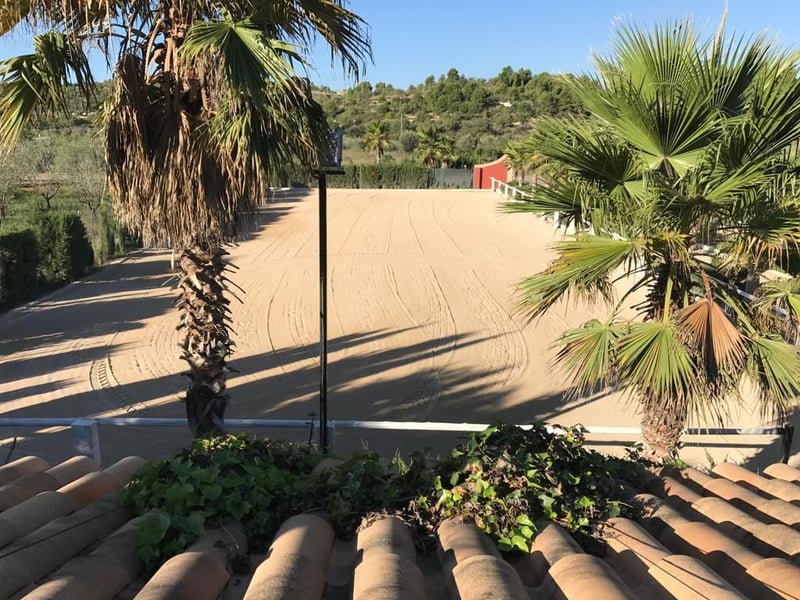 Deze exclusieve manege, gebouwd in 2012, ligt in de gemeente Buñol, in de provincie Valencia (Spanje). Met 343 zonuren per maand is Valencia een van de zonnigste gemeenten van Europa! Er is momenteel een fokkerij, een manege en een pensionstal op het terrein. Het hele landgoed heeft een oppervlakte van 15.000 vierkante meter en omvat: - een parkeerplaats - 1 round pen - 15m x 50m rijhal - 25mx50m manege - een manege (60m2) met 2 badkamers, eetkamer met houtkachel en een veranda van 50m2 met barbecue. In het bovenste gedeelte van het gebouw is er een terras van 60m2. - Grote zadelkamer met videobewaking en alarmsysteem (aangesloten op een beveiligingsbedrijf) - 22 boxen (3mx3m elk) met automatische waterbakken - 2 ruimtes voor de opslag van voer en reinigingsmateriaal, waarvan een met een silo met een capaciteit van 8000kg - douches voor de paarden - 260m2 open omheining - Overdekte ruimte van 40m2 voor de fokmerries op 1800 meter grond (omheind) - tuin en zwembad met een capaciteit van 70000 liter: - verschillende paddocks - 9000m2 braakliggend terrein Bovendien loopt er een irrigatiesloot door het landgoed zodat het zowel gebruikt kan worden als drenkplaats voor de dieren als voor irrigatie. Het hele terrein heeft een verhard looppad, dat overdekt is. De finca is zelfvoorzienend wat betreft elektriciteit dankzij een zonne-energiesysteem, maar kan gemakkelijk worden gevoed via het lokale elektriciteitsnet. Van de 1500 vierkante meter die legaal bebouwd zou kunnen worden, is 800m2 nog vrij en kan gebruikt worden voor extra boxen, opslagloodsen of appartementen. De paden zijn beplant en worden geïrrigeerd met druppelirrigatie. Het object ligt op slechts 5 minuten van de snelweg A3 Madrid-Valencia en 20 minuten van Valencia. Buñol is een stad met alle voorzieningen: Gezondheidscentrum, RENFE treinstation, scholen, winkels, enz. De boerderij heeft een vergunning om 45 paarden te houden en is erkend als ruiterclub door de Koninklijke Hippische Federatie van de Valenciaanse Gemeenschap (Real Federación Hípica de la Comunidad Valenciana).