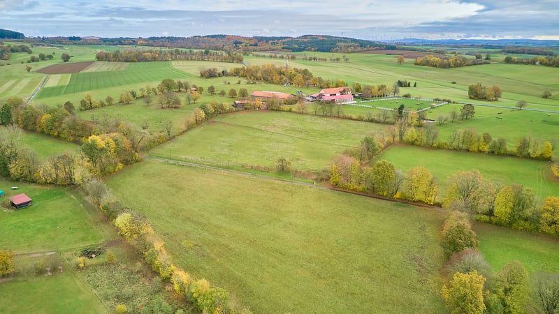 Reitanlage in Alleinlage mit Platz für derzeit 32 Pferde & über 8 Hektar Eigenland! Objektbeschreibung: Diese Reitanlage liegt in ruhiger Alleinlage in einem Ortsteil von Birstein und vereint funktionale Infrastruktur mit behaglichem, ländlichem Wohnambiente. Das Anwesen erstreckt sich über ein Grundstück von ca. 83.879 m² im Eigentum, zusätzlich können ca. 17.500 m² gekauft / gepachtet werden und weitere 25 ha Pachtfläche können ebenso übernommen werden. Das Landhaus verfügt über eine Wohnfläche von ca. 350 m², verteilt auf drei Wohneinheiten, darunter eine kleine Personalwohnung. Die beiden großen Wohneinheiten lassen sich durch eine Verbindungstür zu einer Einheit zusammenfassen, sind jedoch bei Bedarf auch weiter trennbar. Das Gebäude wurde regelmäßig modernisiert, die Bäder und Küchen 2020 erneuert. Ausgestattet ist das Haus mit einer Luft-/Wärmepumpe und einer Ölheizung, sowie Fußbodenheizung und gemütlichen Kachelöfen. Ein großer Garten mit einem neuwertigen Außenpool sorgen für eine gewisse Exklusivität. Die Reithalle aus dem Jahr 2004 bietet mit 20 × 40 Metern Reitfläche und einem Sand-/Textilboden optimale Trainingsbedingungen. Die Leimbinderkonstruktion, großzügige Lichtbänder und ein angrenzendes Reiterstübchen sorgen für eine helle, funktionale und angenehme Arbeitsatmosphäre. Ergänzend steht ein großer, drainierter Gras-Reitplatz, ein Longierzirkel (Ø 18 m) und eine Führmaschine für vier Pferde zur Verfügung. Die Stallungen wurden in den Jahren 1970, 1990 und 2020 errichtet bzw. modernisiert und bieten Platz für bis zu 32 Pferde, verteilt auf Paddockboxen, Innenboxen und Offenstallplätze. Eine große, geschlossene Bergehalle aus 1958 mit 350 m² bietet ausreichend Platz für Lagerung von rund 300 Rundballen. Die weitläufigen Weiden und Koppeln grenzen direkt an die Stallungen an und ermöglichen eine artgerechte Haltung mit viel Bewegung. Für den täglichen Ablauf stehen zudem eine genehmigte Mistplatte, ausreichend PKW-Stellplätze sowie ein Anhängerparkplatz zur Verfügung. Der Charme des Landhauses, die großzügigen Flächen und die ruhige Alleinlage machen dieses Anwesen zu einem Ort, an dem man sich sowohl im Alltag als auch im Reitsport sofort zuhause fühlt. Ausstattung: Wohnhaus: - Baujahr: 1958 Ursprung, An- und Ausbau in 1991, 2004 - Wohnfläche: ca. 350 m², 3 Wohneinheiten - Heizung: Öl aus 2010, Fußbodenheizung, Kachelofen, Luft-/Wärmepumpe im “Althaus” - Bauweise: Massivbauweise - Modernisierungen: Bäder und Küchen im Jahr 2020 - Fenster: Kunststoff-/ Holz, Doppel-Verglasung, Sprossenfenster (Bj.1985, 1991, 2004) - Dämmung: Dach und Zwischendecken - Großer privater Garten am Haus - Außen-Pool mit den Maßen 6,5 x 3,8 aus dem Jahr 2021 (beheizbar per Wärmepumpe) Reithalle: - Baujahr: 2004 - Reitfläche: 20 x 40 Meter - Boden: Sand-/Textilgemisch - Konstruktion: Leimbinder - Reiterstübchen mit Blick in die Reithalle Reitplatz (Vielseitigkeit): - Baujahr 2005 - Maße: 70 x 110 Meter - Boden: Gras, drainiert - Einzäunung vorhanden Unterbringung der Pferde: - Baujahr der Stallgebäude 1970, 1990 und 2020 - Tränken: Frostfreie Balltränken Offenstall, Suevia Umlauf in den Padockboxen - Maße: zwischen 3 x 3 und 3 x 4 Meter - Mehrere Sattelkammern vorhanden Insgesamt können untergebracht werden: 32 Pferde - 10 Paddockboxen - 4 Boxen ohne Paddock - 8 Laufställe für insgesamt 18 Pferde / Ponies Führmaschine: - Platz für 4 Pferde - Baujahr: 2020 - Boden: Gummiknochensteine Bergehalle: - Baujahr: 1958 - 350 m² Bruttogrundfläche (vollständig geschlossen) - Lagerung von rund 300 Rundballen - Boden: Beton Longierzirkel: - Baujahr: 2010 - Boden: Sand-/Textilgemisch, drainiert - Durchmesser 18 Meter - Einzäunung vorhanden Weiteres: - Genehmigte Mistplatte - Anhängerparkplatz, PKW Stellplätze - Ein Antrag an die Kreiswerke MKK ist bereits genehmigt für PV Anlage mit 24 kW Lage: Die Reitanlage befindet sich in einem Ortsteil der Gemeinde Birstein im hessischen Main-Kinzig-Kreis. Über die Bundesstraße B276 und die B457 besteht eine schnelle Anbindung in Richtung Gedern, Gelnhausen und Büdingen. Von dort aus sind die Autobahnen A66 (Frankfurt–Fulda) und A45 (Hanau–Gießen) in kurzer Zeit erreichbar. Die Bahnhöfe in Wächtersbach und Gelnhausen bieten Anschluss an den Regional- und Fernverkehr mit direkter Verbindung nach Frankfurt am Main, Hanau und Fulda. Der internationale Flughafen Frankfurt (FRA) ist mit dem Auto in etwa 60–70 Minuten erreichbar, ebenso der Flughafen Frankfurt-Hahn in rund 90 Minuten. Die Gemeinde bietet eine hohe Lebensqualität in naturnaher Umgebung. Der Ortsteil ist Teil der familienfreundlichen Gemeinde Birstein, die für ihr reges Vereinsleben, eine gute Grundversorgung und ihre idyllische Lage im Naturpark Vogelsberg bekannt ist. Im Ort selbst und in den umliegenden Ortsteilen finden sich zahlreiche Vereine, die ein vielfältiges Freizeit- und Gemeinschaftsangebot schaffen – von Reit- und Sportvereinen über Feuerwehr- und Musikvereine bis hin zu kulturellen Initiativen. Für den täglichen Bedarf stehen in Birstein und den Nachbargemeinden Einkaufsmöglichkeiten, Bäckereien, Metzgereien, Banken und Gastronomie zur Verfügung. Ein größerer Einzelhandels- und Supermarktstandort befindet sich im nahen Wächtersbach, nur wenige Fahrminuten entfernt. Im Bereich Bildung verfügt Birstein über eine Grundschule sowie eine Gesamtschule mit gymnasialem Zweig. Weiterführende Schulen und Berufsschulen sind in Wächtersbach, Gelnhausen oder Büdingen gut erreichbar. Auch die medizinische Versorgung ist gesichert: In Birstein gibt es Hausärzte, Zahnärzte und eine Apotheke, weitere Fachärzte und das Krankenhaus Gelnhausen sind in rund 25 Minuten erreichbar. Die Kombination aus ruhiger Lage, intakter Dorfgemeinschaft und guter Erreichbarkeit der umliegenden Städte macht die Gegend zu einem attraktiven Wohnort – ideal für Familien, Naturfreunde und alle, die ländli