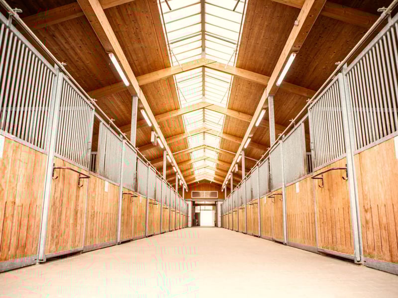 This equestrian center leaves nothing to be desired and offers first-class infrastructure for all areas of equestrian sports and breeding. A unique selling point not only within this region but also beyond, this riding center features XXL-sized training facilities, including a 45 m x 90 m riding arena and an indoor riding hall, complemented by a large lunging system and a round pen. For breeding purposes, there are spacious open stables with direct access to extensive pastures, beautifully framed by woodland. The property covers approximately 10 hectares of owned land, supplemented by around 8 hectares of leased areas. In addition to the XXL training facilities, this estate impresses with its stunning location in scenic surroundings, expansive paddocks bordered by woodland, and unlimited riding opportunities through meadows and forests. Ownership area: approx. 10 ha Managed area: approx. 18 ha Residential spaces: – 2 apartments – Preliminary building approval for owner/manager’s residence Number of horses: up to approximately 60 horses Training options: – XXL indoor riding hall – XXL outdoor riding arena – Lunging system – Round pen Housing types: – Paddock boxes – Outdoor boxes – Stables – Open stalls with paddock access Other information: Environmental certification (EnEv) is in preparation. The inventory and machinery are not included in the purchase price. The indicated location is not the exact site to protect the privacy of the owner. We are happy to provide you with detailed information. Please contact us. Thank you. Additional images of this property and other real estate offers can be found at www.wir-immobilien.com W.I.R. Immobilien – Your specialist real estate agent for equestrian facilities and agricultural estates