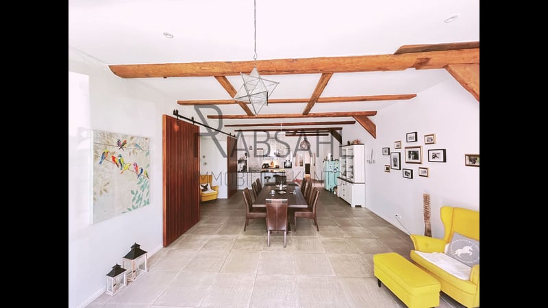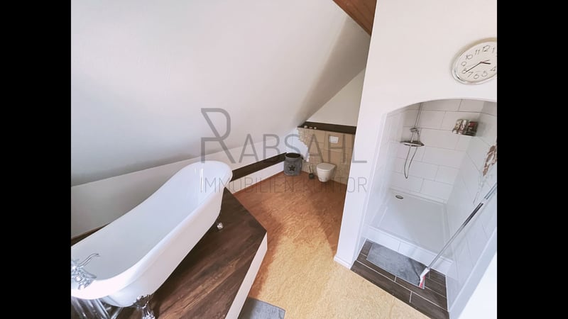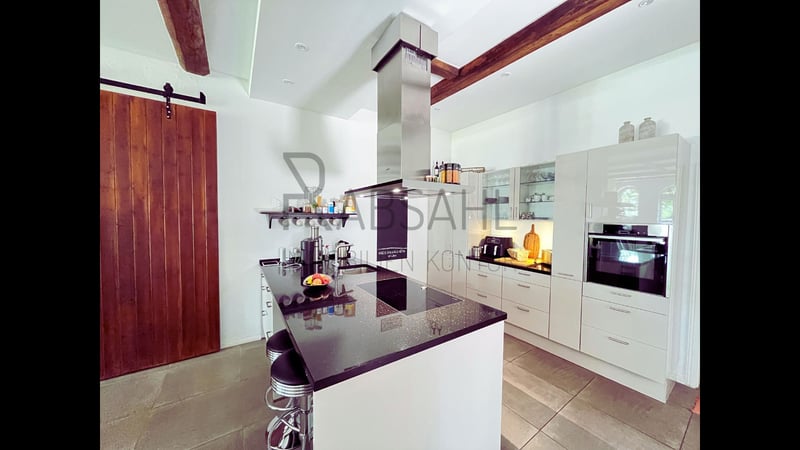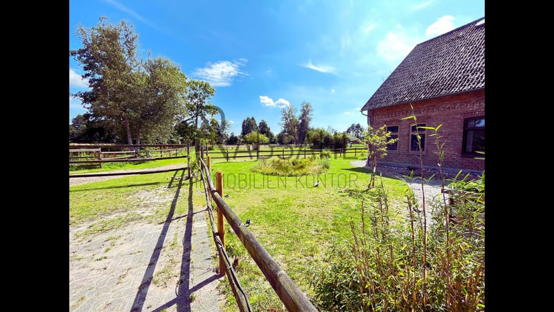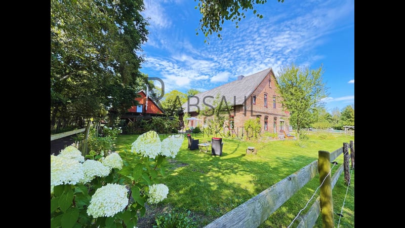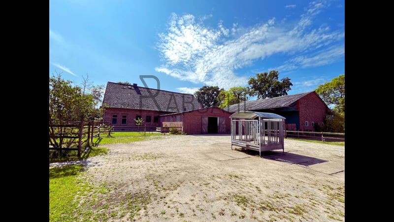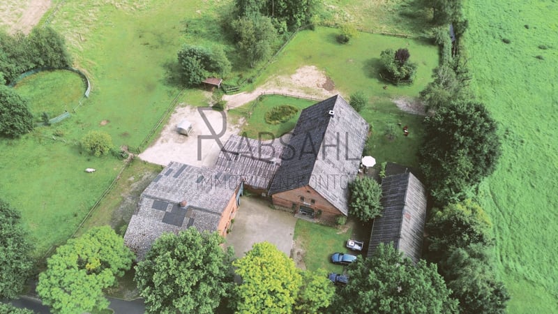 Welcome to your new home: a charmingly renovated old farmhouse in Rhade. This unique property combines rural idyll with modern living comfort and offers a variety of possible uses. The one-and-a-half-storey house has a total of approx. 200 m² of living space, divided into seven rooms, including three spacious bedrooms and three stylishly designed bathrooms. The high-quality fittings include parquet and tiled floors which, together with the underfloor heating, create a pleasant living environment. The property for sale has a partial basement and offers additional parking and storage space. Particularly noteworthy is the barn, which has been beautifully converted into a kitchen and dining room and perfectly underlines the charm of the house. The hayloft also offers scope for expansion, so there are no limits to your creativity. For horse-lovers, this remaining farm fulfills every wish: a paddock, a meadow, two open stables, four boxes and a hay store are already available and allow horses to be kept right next to the house. Enjoy sunny days on the cozy terrace, which invites you to relax and linger and offers a direct view of the horses. The horse farm is available immediately by arrangement and offers you the unique opportunity to call a piece of rural idyll in Rhade your own. Don't hesitate to contact us today to arrange a viewing. This property could soon be your new home! The farm on offer is fully equipped for keeping horses. Four horses (two large horses, two ponies) currently have their home here. The paddock with a large hay rack stretches across the southern part of the garden and is right next to the house. On the eastern side is an open stable built in 1980 for the horses. The separate barn houses four horse boxes and the hay store. On the western side, in the outbuilding, there is another open stable, which the horses like to use as sun protection in summer. All stables and two boxes are equipped with high-quality forest flooring, the window boxes with straw pellets. There is a heated drinking trough and the entire paddock can be set up as an active stable. Directly adjacent to the paddock is the summer pasture as well as a round pen and an open area that can be used as a riding arena if required. Overall, horses and their owners will find optimal conditions for keeping up to 8 horses on this farm. The charming remaining farm is located in the idyllic village of Rhade. Rhade belongs to the municipality of Selsingen and lies in the charming countryside of the Elbe-Weser triangle in Lower Saxony. This quiet and natural location offers both relaxation and numerous opportunities for leisure activities in the surrounding area. The cities of Bremen, Hamburg and Bremerhaven are easily accessible thanks to the good connection to the B71 federal highway and the nearby A1 freeway. In addition, the nearby town of Zeven offers a comprehensive infrastructure with shopping facilities, schools, nurseries and medical care. The surrounding fields and forests offer a wonderful backdrop for walks, bike rides and horseback riding. Rhade itself is characterized by a harmonious village community and offers various cultural and sporting events that promote social interaction. The location combines the advantages of rural life with the amenities of urban proximity. This combination of a quiet location, good accessibility and comprehensive infrastructure makes the horse farm in Rhade an ideal place for families, nature lovers, horse owners and anyone who appreciates life in the countryside. General data: Living space: approx. 200 m² Plot area: 16,333 m² Heating: underfloor heating, gas boiler Energy certificate: in preparation Brokerage fee: 2.65% incl. VAT This offer is subject to a brokerage fee for the buyer. Upon conclusion of a notarized purchase contract, a brokerage fee of 2.65% plus VAT is due. A provision to the same effect has been agreed with the seller. All information was provided by the vendor. Rabsahl Immobilien Kontor assumes no liability for the correctness of all information. Subject to prior sale. The energy certificate is currently being prepared and can be presented for viewing.