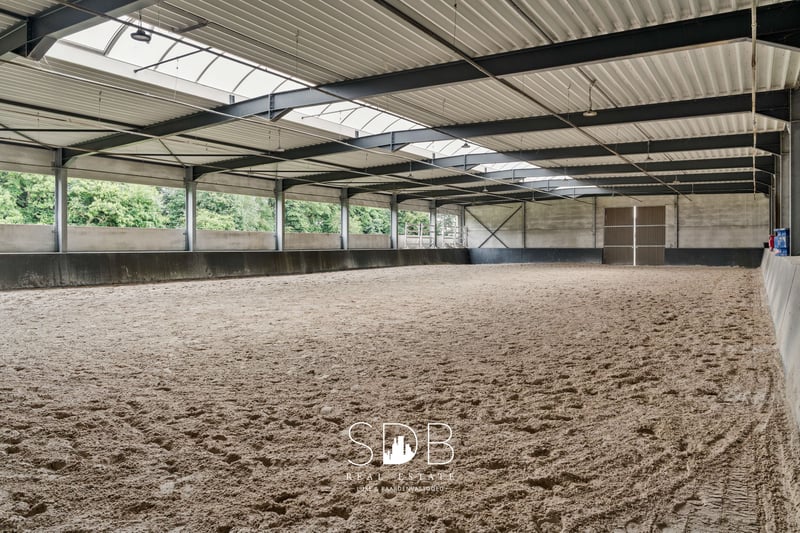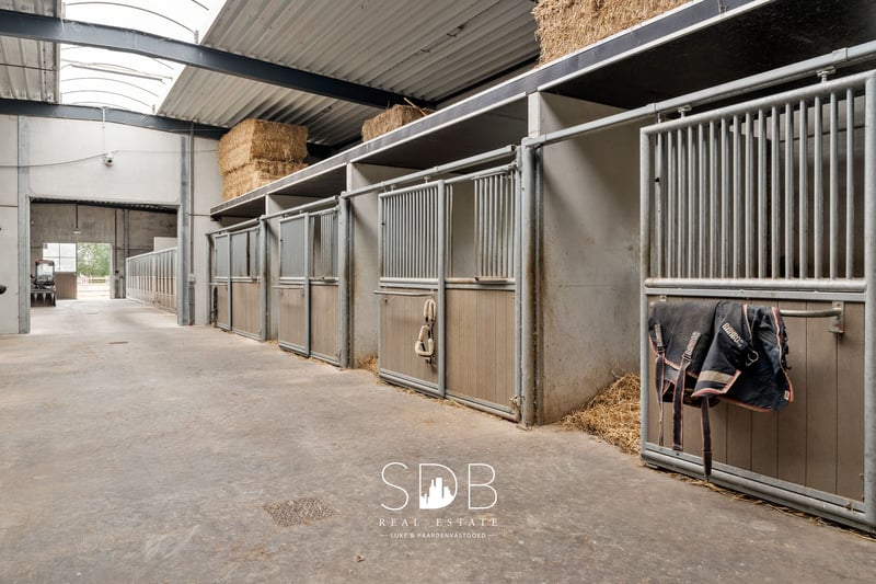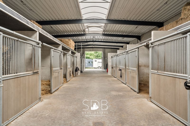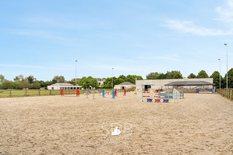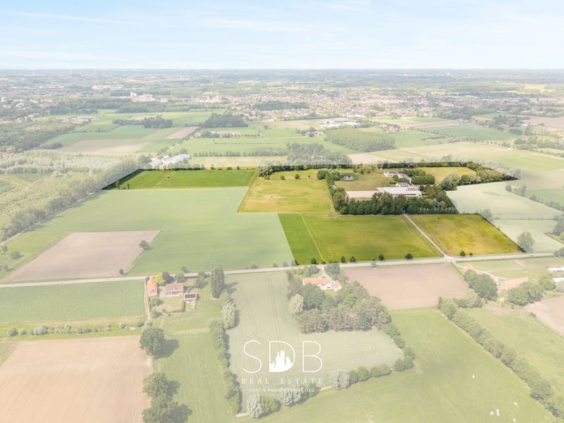 Located in Deinze, in the East Flanders region, strategically positioned between Ghent and Kortrijk, this stunning villa with equestrian facilities is surrounded by pastures on a plot of approximately 23 hectares. This elegant villa stands out for its high-quality, stylish materials, rural charm, and spacious open living areas, with a strong emphasis on comfort and warmth. The accompanying equestrian infrastructure exudes professionalism and offers numerous possibilities for both semi-professional and professional riders. Upon entering the impressive entrance hall, you are immediately immersed in rustic charm and refinement, with a harmonious balance between space and light. There are two generous living areas, each with its own dining space and cosy sitting area, complemented by an open fireplace, high ceilings, large windows, and light, timeless colours. Both living spaces offer views of the terrace and surrounding meadows. Adjacent to the living areas is the spacious kitchen with an island, fully equipped with all modern facilities. This bright, country-style kitchen creates an open and inviting atmosphere with a contemporary feel and practical layout. The adjoining utility room includes connections for a washing machine and dryer. Numerous built-in cupboards provide ample storage space, and the work surfaces make the room highly functional. A stylish home office with additional living space, finished with custom-made built-in cabinetry. Also on the ground floor is a multifunctional room that can be used flexibly. This space can also offer a more private character, making it suitable for additional living accommodation. On the first floor, you will find five full-sized bedrooms, each with its own spacious bathroom. The master bedroom also includes a walk-in dressing room. Each of the five bathrooms exudes luxury and features a washbasin unit, shower, and/or bathtub. A sixth room offers versatility and can serve as an additional bedroom, hobby room, or relaxation space. The beautiful villa overlooks the surrounding meadows and professional equestrian facilities. In the first stable building, you will find an indoor arena measuring 20 x 40 metres, with a stylish clubhouse overlooking the arena. This same building houses 8 stables and a wing with walk-in stalls, ideal for young horse rearing. In addition, there are several grooming areas, a solarium, palpation box, tack room, and various storage rooms. There is also space for storing hay and straw. This building also includes accommodation for grooms. The second stable building contains 8 additional stables. For training purposes, the property includes not only an indoor arena, but also an outdoor arena measuring 33 x 55 metres with a professional footing, a 4-horse walker, and a gallop track that encircles the estate. There is ample space on the domain for parking cars and horse trucks. The surrounding pastures are fully fenced with wooden fencing and divided into several paddocks. A private driveway leads from the secure entrance to the estate. This property offers complete privacy and a wide range of possibilities for professional expression within the equestrian world. Nonetheless, every horse lover will feel at home here—peace, privacy, and a warm, family-friendly atmosphere are the absolute highlights of this exceptional estate. If you are interested in this unique property, do not hesitate to contact us. www.sdb.realestate
