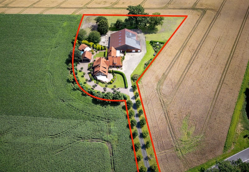 This property was built in 1956 and 1999 on a 8,976 sqm plot of land in a quiet, rural outskirts location with unobstructed views in the district of Teglingen, Meppen. The surroundings offer a pleasant mix of natural living and convenient access to everyday amenities. This spacious rural estate includes two residential buildings on a large parcel of land with versatile options for living, working, and keeping animals. The original house from 1956 was expanded in 1999 with an additional residential building. The combination of traditional construction and modern amenities allows for flexible use and creative design options. In addition to the residential buildings, there are extensive utility areas and well-maintained outdoor facilities. The natural setting provides an unobstructed view of the surrounding fields and combines peaceful living with good accessibility to the district town of Meppen. A photovoltaic system installed in 2004 ensures additional income through full feed-in of electricity. The residence built in 1999 features a spacious and modern layout. On the ground floor, there is an open foyer with a wardrobe area, a bright living/dining room with a tile stove and direct access to the terrace, as well as a large country-style kitchen with a breakfast nook (built-in kitchen included in the purchase price). The stylishly designed summer conservatory, added in 2021, extends the living space and provides a sheltered outdoor retreat. A guest WC completes the room layout on this level. The upper floor offers a large master bedroom with an adjoining walk-in closet, two additional rooms that can be used as children's, work, or guest rooms, and a modern daylight bathroom with two washbasins, a walk-in shower, and built-in cabinets. The partial basement includes a storage room, a fitness room, and the heating room with space for a washing machine and dryer. The original house has been modernized and features a bright, glazed winter garden on the ground floor, harmoniously connecting the living area with the outdoor space. The spacious living and dining room provides ample space for social gatherings, while a separate TV room offers additional retreat options. The modern fitted kitchen from 2016 is included in the purchase price. It is complemented by a utility kitchen with a nostalgic oven, offering extra storage and workspace. The hallway leads to a guest WC with a sink and toilet, as well as a bedroom. A daylight bathroom with a shower, corner bathtub, and washbasin completes the room layout on this floor. Upstairs, there are three additional rooms that can be flexibly used as bedrooms, guest rooms, or offices. The attic is accessible via a pull-down ladder. The partial basement contains a storage room and the heating system. Both houses offer various usage concepts. They are suitable for multi-generational living, as they provide separate living units. The original house, with a bedroom and bathroom on the ground floor, also allows for single-story living. Partial rental is also possible to generate additional income. For horse enthusiasts, the estate offers ideal conditions. The utility building has adaptable stables and storage areas for hay, straw, or other equipment. There is also a dedicated area for horse care, a saddle room, and an enclosed outdoor riding arena with natural footing. The adjoining pasture allows for species-appropriate animal husbandry. The surrounding agricultural fields are currently leased, with the possibility of taking over the lease by arrangement.