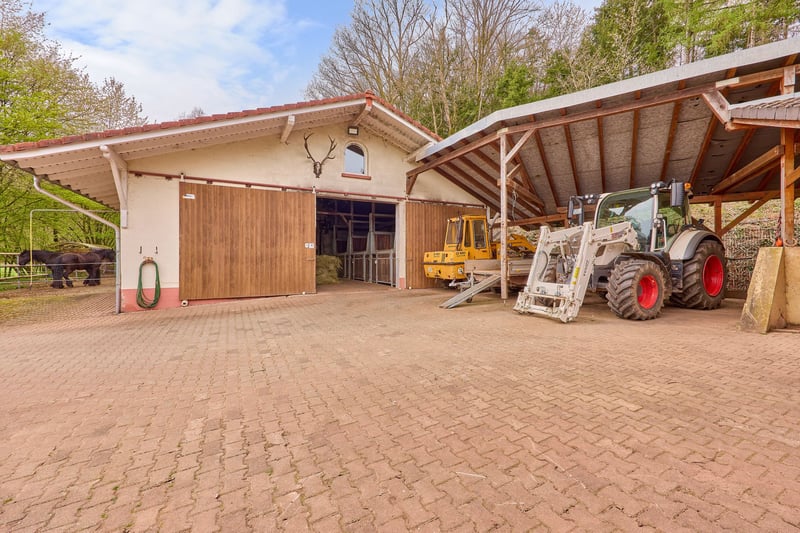 Bitte füllen Sie das nachfolgende Kontaktformular vollständig aus bevor Sie uns telefonisch kontaktieren. Vielen Dank für Ihr Verständnis! Pferdeimmobilie im Saarland (Wadern) mit großem Wohnhaus, moderner Reithalle und direktem Ausreitgelände! Objektbeschreibung: Dieses Gestüt in Wadern-Gehweiler im Nordsaarland überzeugt durch seine ruhige Alleinlage, eine durchdachte Hofstruktur und großzügige Flächen von ca. 40.327 m² im Eigentum zzgl. ca. 28.605 m² Pachtland. Teile der Flächen liegen im Naturschutzgebiet Wadrilltal und unterstreichen die besondere landschaftliche Qualität. Das Wohnhaus (Baujahr 1968–1973) bietet ca. 193 m² Wohnfläche und wurde in solider Massivbauweise errichtet. Es verfügt über eine Einbauküche mit Geräten von Miele und Liebherr, doppelt verglaste Fenster sowie eine Mischung aus Fliesen-, Parkett- und Teppichböden. In den letzten Jahren wurden u. a. die Fassade (2007) sowie 2025 eine moderne Ölbrennwertheizung inklusive Warmwasser, Abgasleitung und Kamin erneuert. Ein Wintergarten mit Blick auf Stall und Weiden, eine Terrasse, Stellplätze und eine Garage ergänzen das Wohnangebot. Die städtische Versorgung mit Wasser, Strom und Glasfaseranschluss ist gewährleistet. Zusätzlich gibt es einen Brunnen sowie eine Kleinkläranlage. Der Pferdebereich ist funktional und gut ausgestattet: Ein Stallgebäude (1996) mit ca. 152 m² bietet 10 großzügige Boxen (3 x 4 m) mit beheizbarem Tränkensystem. Ergänzt wird dieser durch eine Lagerhalle mit überdachtem Mistplatz (2003), Offenstallplätze, Putzplätze und Untersuchungsstand. Die Reithalle (Baujahr 2007) mit einer Reitfläche von ca. 20 x 40 m, hochwertigem Boden (Kirchhellner Sand), Beleuchtung und kleiner Tribüne bietet optimale Trainingsbedingungen. Zusätzlich steht eine Longierhalle (Ø 13 m, Baujahr 2002) zur Verfügung. Koppeln sind direkt vom Hof aus erreichbar! Abgerundet wird das Angebot durch gepflasterte Hofflächen, Maschinenunterstände sowie umfangreiche Lagerkapazitäten für Futter. Eine Bauvoranfrage für einen weiteren Reitplatz mit Ovalbahn liegt vor. Insgesamt bietet die Anlage ideale Voraussetzungen für Pferdehaltung, Training oder Zucht in naturnaher und gleichzeitig gut angebundener Lage. Ausstattung: Wohnhaus: - Baujahr: 1968 – 1973 - Wohnfläche: ca. 193 m², 1 Wohneinheit - Einbauküche aus 1996 mit Geräten von Miele und Liebherr - Heizung: Heizöl aus November 2025 - Sanierungen: Leitungssysteme aus 1996, Einbau einer Ölbrennwertheizung inkl. Warmwasser- RLU in & Einbau einer Abgasleitung für Überdruck in einem bestehenden Schacht im Jahr 2025, Fassade in 2007 erneuert, Kaminofen im Wohnzimmer Fabr. Oranier aus 2025 - Massivbauweise, nicht unterkellert - Fenster: Doppelverglasung, Holz & Kunststoff (außer Wintergarten im OG) - Wintergarten mit tollem Ausblick zum Stall und den Weiden, genutzt als Büro Versorgung: - Neu verlegte Strom und Glasfaseranschlüsse direkt zum Wohnhaus - Städtische Wasserversorgung: Wasserleitung wurde 2010 neu zum Haus gelegt - Brunnenanlage: für Stall und Brauchwasser Toilette und Waschmaschine, Außenanschlüsse (inkl. Pufferspeicher mit 250 Liter Fassungsvolumen und Tiefbrunnenpumpe, automatische Nachspeisung) - Mechanisch-biologische Kleinkläranlage für 4 Personen, Abnahme erfolgte 2004 Pferdestall: - Baujahr Gebäude: 1996 - 10 Pferdeboxen - Maße 3 x 4 Meter mit Drehtüren und geschwungener Ausführung, Trennwände sind flexibel zu entfernen, um Doppelboxen (Abfohlboxen) zu errichten - Tränkenheizung: Thermostat mit Kreislaufsystem Fabrikat Suevia, Selbsttränken (im gesamten Stall und auf den Paddocks) - Dach: Ziegeleindeckung und Lüftungssteine, First-Lichtband - Massivbauweise mit gemauerten Wänden, Innen- und Außenputz Angrenzende Lagerhalle mit Mistplatz: - Anbau der landwirtschaftlichen Lagerhalle mit überdachtem Mistplatz im Jahr 2003 an den bestehenden Pferdestall - Mistplatz mit 24 m² - 6 Offenstallplätze im Außenstall - Putzplätze & Untersuchungsstand vorhanden - Dach: Stahlkonstruktion mit Trapezblech Reithalle: - Baujahr: 2007, Baugenehmigung 2003 / 2004 (Maße 27,5 x 45 Meter) - Anschleppung für Maschinen, 2 Laufställe (3 x 5 Meter) - Reitfläche: 20 x 40 Meter - Boden: Kirchhellner Sand auf Lava - Beleuchtet - Konstruktion: Holz-Leimbinder - Dach: Trapezblech mit Anti-Tropf Beschaffenheit und Lichtplatten Longierhalle: - Baujahr: 2002 - Durchmesser: 13 Meter - Boden: Split, Wabengittermatten - Holz-Bande & Beleuchtung vorhanden Koppeln: Direkt am Hof zu begehen gelangen Sie auf die Koppelflächen. Weiteres: - Mistplatte am Stallgebäude, überdacht (genehmigt) - Gepflasterte Hofflächen - Maschinenunterstand und Carport am Stall - Futterlagerung an der Reithalle von bis zu 150 Rundballen Lage: Der Ortsteil Gehweiler der Stadt Wadern im Landkreis Merzig-Wadern ist verkehrstechnisch gut an das regionale und überregionale Straßennetz angebunden. Über die nahegelegene Autobahn A1 sowie die Anschlussstellen Braunshausen/Kastel und Nonnweiler ist eine schnelle Verbindung in Richtung Saarbrücken (ca. 60 Autominuten), Trier (35 – 40 Autominuten) und Luxemburg gewährleistet. Der nächste größere Flughafen ist der Flughafen Saarbrücken (SCN), der in etwa 50–60 Minuten mit dem Auto erreichbar ist. Alternativ stehen auch die Flughäfen Luxemburg und Frankfurt-Hahn in gut erreichbarer Distanz zur Verfügung. Der Hof befindet sich in ruhiger, naturnaher Lage im Ortsteil Gehweiler der Stadt Wadern im Hochwaldgebiet. Die Ortschaft Gehweiler liegt in einer Höhenlage von 300 bis ca. 330 m. über N.N. und ist dem Schwarzwälder Hochwald mit Höhen zwischen 600 und knapp 700 Metern vorgelagert. Trotz der idyllischen, ländlichen Umgebung ist die Grundversorgung in kurzer Fahrdistanz sehr gut erreichbar. Im nahegelegenen Stadtgebiet Wadern stehen sämtliche Einrichtungen des täglichen Bedarfs zur Verfügung. Dazu zählen mehrere Supermärkte, Bäckereien sowie vielfältige Einzelhandels- und Dienstlei