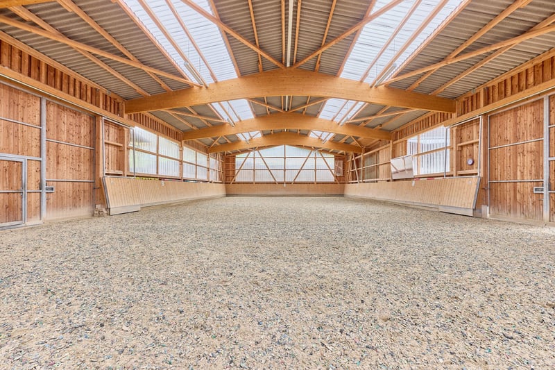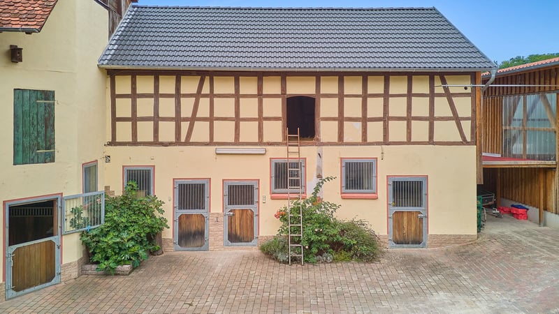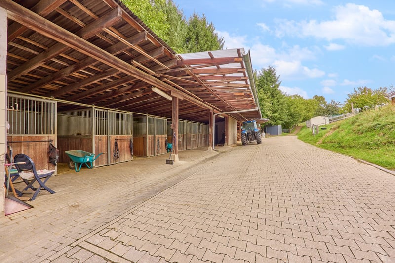 Pferdeimmobilie in Hessen im Landkreis Darmstadt-Dieburg zu verkaufen! Objektbeschreibung: Dieses außergewöhnliche Anwesen in einem Ortsteil von Groß-Bieberau bietet optimalen Bedingungen für Pferdeliebhaber. Das rund 18.379 m² große Grundstück (zzgl. weitere gepachtete Koppeln) umfasst ein Wohnhaus mit separater Wohnung, einen gepflegten Innenhof, zahlreiche Stallungen, eine moderne Reithalle sowie weitläufige Koppeln und einen Reitplatz. Das Wohnhaus, ein Fachwerkbau aus dem Jahr 1830, bietet ca. 160 m² Wohnfläche und wurde über die Jahre umfangreich saniert und modernisiert. Strom- und Wasserleitungen wurden 2008 erneuert, zwischen 2007 und 2011 erfolgten weitere Modernisierungen. Eine Holzpelletheizung aus 2013 sorgt für effiziente Wärme. Ein Wintergarten, eine Doppelgarage und der gepflegte Garten unterstreichen die Wohnqualität. Zusätzlich steht eine separate Wohnung mit ca. 110 m² Wohnfläche zur Verfügung, die 2013 modernisiert wurde. Der große, gepflasterte Innenhof bildet das Herzstück des Anwesens. Hier befinden sich eine Scheune mit Stallungen, Reiterstübchen, Sattelkammer sowie 9 Innenboxen und ein großzügiges Heulager. Hinter der Reithalle liegen weitere 7 Außenboxen inkl. beheizbarer Tränkenleitungen mit abschließbarer Sattelkammer und Maschinenunterstand. Besonders hervorzuheben ist die moderne Reithalle (Baujahr 2016) der Firma Römmelt (30 x 15 m) mit Sand-Textilboden aus 2021, ergänzt durch einen Reitplatz von ca. 20 x 40 Metern mit Allwetterboden (2019). Mehrere Koppeln und Winterpaddocks schließen direkt an den Hof an, zusätzlich stehen gepachtete Koppelflächen (1,4 ha) zur Verfügung. Ein Offenstall, eine Mistplatte (2021 erneuert), ein Brunnen sowie Heulagerflächen für rund 60 Rundballen runden die Reitanlage ab. Zwischen 2019 und 2023 wurden zahlreiche Modernisierungen im Außenbereich umgesetzt, u. a. Stromleitungen, Lauf- und Fahrwege, Winterpaddocks sowie Dachsanierung eines Scheunenteils. Ideal für Pferdeliebhaber, die Ruhe und die Nähe zu Darmstadt schätzen. Ausstattung: Wohnhaus: - Baujahr: 1830 - Wohnfläche: ca. 160 m² - Heizung: Holzpellets aus 2013 - Bauweise: Fachwerk - Fenster: Kunststoff, Doppel-Verglasung - Boden: Fliesen - Dach: Satteldach, Ziegel, gedämmt - Sanierungen: Strom- und Wasserleitungen 2008 - Modernisierungen: 2007 bis 2011 neue Fliesen, Bäder, Heizkörper - Toreinfahrt Überdachung 1964 - Doppelgarage 1975 Einliegerwohnung: - Baujahr Gebäude: 1830, Einbau Wohnung vermutlich 2013 (Bauakte ist angefragt) - Wohnfläche: ca. 110 m² - Sanierungen: Strom- und Wasserleitungen in 2008 - Modernisierungen: 2013 neue Fliesen, Bäder, Heizkörper - Gartenzugang Innenhof: - Große Scheune mit Stallungen - Reiterstübchen - Sattelkammer & Futterkammer - Heizungsraum mit Holzpellet-Heizung und Speicher Stallungen (Innenhof): - Baujahr Gebäude 1830 - 9 Pferdeboxen - Heulager Stallungen (hinter Reithalle): - Baujahr 1960 - 7 Außenboxen (3 x 4 Meter) - Tränken vorhanden (Leitungssysteme der Tränken beheizbar) - Sattelkammer (abschließbar) - Maschinenunterstand Reithalle: - Baujahr 2016 - Reitmaß 30 x 15 Meter - Boden: Sand-/Textilgemisch aus 2021 - Hersteller: Firma Römmelt Reitplatz: - Maße: ca. 20 x 40 Meter - Boden: Allwetter-Boden (AS Ground, Drainage) - Erneuerung des Reitplatzes in 2019 Koppeln / Winterpaddocks: - 3 befestigte Winterpaddocks - mehrere Koppeln am Hof - ca. 1,4 ha Pachtkoppel direkt angrenzend an den Eigentum Weiteres: - Offenstall auf einer Weide - Mistplatte (überdacht) 2021 - Brunnen - Heulagerung insgesamt für rund 60 Rundballen Lage: Groß-Bieberau befindet sich etwa 15 Kilometer südöstlich von Darmstadt und damit im direkten Einzugsbereich des Rhein-Main-Gebiets. Über die Bundesstraße B426 ist der Ort schnell mit dem regionalen Straßennetz verbunden. Die nächste Autobahnanschlussstelle an die A5 bei Darmstadt-Eberstadt liegt rund 20 Kilometer entfernt und ermöglicht direkte Verbindungen Richtung Frankfurt am Main, Wiesbaden/Mainz sowie Heidelberg und Karlsruhe. Auch die A67 und die A3 sind innerhalb von etwa 20 bis 25 Minuten erreichbar. Der internationale Flughafen Frankfurt am Main ist in nur rund 40 bis 45 Autominuten erreichbar. Die Immobilie befindet sich in einem Ortsteil von Groß-Bieberau, einer ruhigen und naturnahen Wohnlage im vorderen Odenwald. Der Hauptort Groß-Bieberau mit seiner guten Infrastruktur ist in wenigen Minuten erreichbar. Hier stehen sämtliche Einrichtungen des täglichen Bedarfs zur Verfügung: mehrere Supermärkte, Bäckereien, Metzgereien sowie Apotheken und Arztpraxen. Für Familien ist das Bildungsangebot sehr attraktiv: In Groß-Bieberau gibt es mehrere Kindergärten, darunter katholische, städtische und private Einrichtungen. Die Grundschule vor Ort deckt die Grundschulbildung ab, während weiterführende Schulen wie die Odenwaldschule Groß-Bieberau (Realschule und Gymnasialzweig) sowie Gymnasien und Berufsbildende Schulen in Darmstadt und Umgebung gut erreichbar sind. Auch die Freizeitmöglichkeiten sind vielfältig: Neben Sport- und Kulturvereinen gibt es Hallen- und Freibäder, Spiel- und Sportplätze sowie zahlreiche Wander- und Radwege in der umliegenden Natur. Einkaufsmöglichkeiten für den größeren Bedarf finden sich zusätzlich im nahegelegenen Darmstadt. Der Ort selbst zeichnet sich durch dörflichen Charakter, eine ruhige Wohnatmosphäre und kurze Wege in die Natur aus. Die Nachbarschaft ist geprägt von Einfamilienhäusern und gepflegten Gärten, was ein angenehmes Wohnumfeld schafft. Gleichzeitig bietet die Lage alle Vorteile einer modernen Infrastruktur, sodass Familien, Paare und Senioren hier gleichermaßen ein komfortables und naturnahes Zuhause finden. Energieausweis: Wesentlicher Energieträger: Holz-Pellets Bedarfsausweis Endenergiebedarf: 111,86 kWh/(m²*a) Energieeffizienzklasse: D Baujahr laut Energieausweis: 2013 Weitere Informationen: Ein unbefugtes Betreten der Reitanlage außerhalb einer Besichtigung mit dem