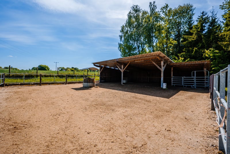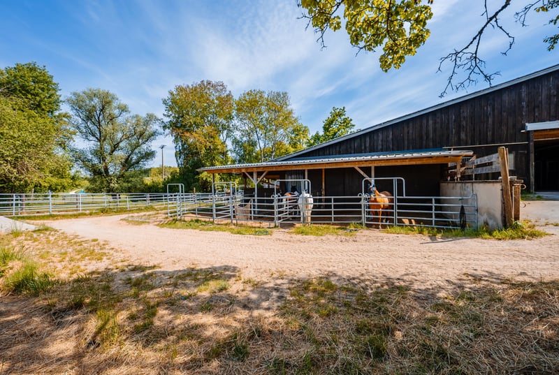 In a tranquil location in Sinzing, this beautiful ranch offers a perfect blend of living and working with horses. With just over 17,000 residents, Sinzing boasts a good infrastructure. Whether it's train connections, supermarkets, doctors, or banks – everything is available and easily accessible. The nearby Danube River is about a 10-minute walk away, inviting relaxing strolls. THE RANCH stands for a lifestyle concept that combines a connection to nature with modern comfort – driven by a passion for horses. A place that harmoniously brings together all these elements: living, working, and personal hobbies merge here into a holistic lifestyle. Directly located at the courtyard, with a view of the facility – yet completely private – is the residential house. Originally built in the 1980s, the house underwent extensive renovations in 2011 and now presents itself as a stylish retreat with rural charm. Approximately 319 m² of living and usable space is spread across two potentially independent units – currently united into a spacious whole. (2 separate entrances available) For those seeking something special: quietly located, close to nature – yet right in the middle of it all. The Residential House The entrance leads into an open kitchen and dining area, flooded with light and generously sized – featuring a large dining table that offers views out to the terrace and pool through the large windows. This is where cooking, laughter, and living happen. A place for family, friends, and special moments. Adjacent to this area is a guest toilet and direct access to the garage – practical for quickly getting groceries into the fridge. From the garage, you can also directly access the laundry room, discreetly and functionally integrated. (Very convenient for a quick entry from the yard into the house – simply through the garage) The living area is the heart of the house: High ceilings, an open roof structure, visible wooden beams, a fireplace for cozy hours – and large skylights that flood the room with daylight. Two terrace accesses open the space to the outside. An elegant country-style staircase leads up to an open gallery, which not only impresses visually but also offers a view – both to the outside and back into the living area. There is also a small bathroom with a shower and toilet on this level. From the gallery, a passage leads to the second unit, which is currently part of the overall space but could be separated and used independently if needed. This level begins with an office, ideal for a home office or administration. The path continues into another kitchen with a dining area, also with access to a balcony overlooking the courtyard – a quiet spot for the first coffee of the morning. A long hallway leads to two bedrooms, one of which has a staircase down to a wash and storage room – versatile for supplies, as a technical room, or as a hobby or guest room. The other branch of the hallway leads to a large bathroom with a shower, bathtub, and toilet – spacious and stylishly designed. At the end of this hallway is another guest room with its own bathroom, including a shower and toilet – perfect for visitors or family members who want their own space. Guest Apartment – Versatile & Independent A special bonus is the small, separately accessible apartment in the house – with its own bathroom (shower/toilet), living/sleeping area, and a compact kitchenette. Perfect for staff, guests, or rental – however you need it. Garage & Outdoor Area The house offers a total of 4 integrated garages, supplemented by 2 additional ones – totaling 6 garage spaces, providing ample room for vehicles, trailers, or equipment. Additionally, the courtyard offers 4 more parking spaces. The Garden Oasis The large terrace invites long summer evenings filled with extensive barbecue delights. The outdoor pool features a practical sliding roof, allowing for year-round use. For those who prefer more heat, there’s a sauna or a bubbling hot tub. A small pool house rounds off the bathing pleasure. The Equestrian Paradise On approximately 2.5 hectares of land, a riding facility unfolds that is second to none – thoughtfully planned, lovingly maintained, ready for new stories. – An indoor riding arena (25 x 50 m) built in 2013, currently set up for Western riding – but easily adaptable for any riding style. – Directly in the riding arena is a riding lounge – perfect for shared moments with fellow riding enthusiasts. From the in-house spectator balcony, it’s possible to enjoy a perfect view of events. For example, Western-style events become a visual delight for owners and guests. – An outdoor riding arena (28.5 x 90 m), large enough for competition ambitions – or simply the perfect daily training space. – Stalls and two open stables for around 30 horses, embedded in generous paddock areas. Three foaling boxes with camera monitoring – ideal for breeders. – Ample parking space (for cars and trailers) is available for boarders and guests. The private area is secured by a barrier system with license plate recognition. – Additional security features: Selected areas, including the riding arena, courtyard, and another box, are under video surveillance. The property also includes open spaces and forest areas in close proximity. The meadows are used for hay production, while the forest provides wood chips for self-sufficient heating – ecological, efficient, and independent. Heating type: Wood pellet heating, oil for hot water preparation, heat pump for the pool (operated via the PV system), and a separate heat pump for the hot water supply for the horse shower. This extraordinary property combines stylish living, a love for horses, and relaxation at the highest level. With its riding facility, pool, and thoughtful architecture, it offers space for living, working, and lifestyle – all in one place.