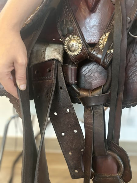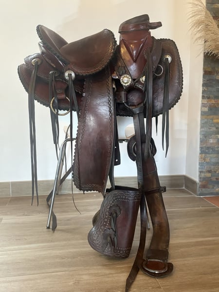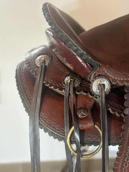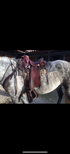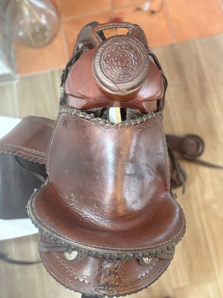 Nous vendons cette magnifique selle mexicaine Dessous feutrine impeccable Toujours bien entretenue Nous avons refaits à neuf les étrivières détails et lacets En excellent état Pas d envoie