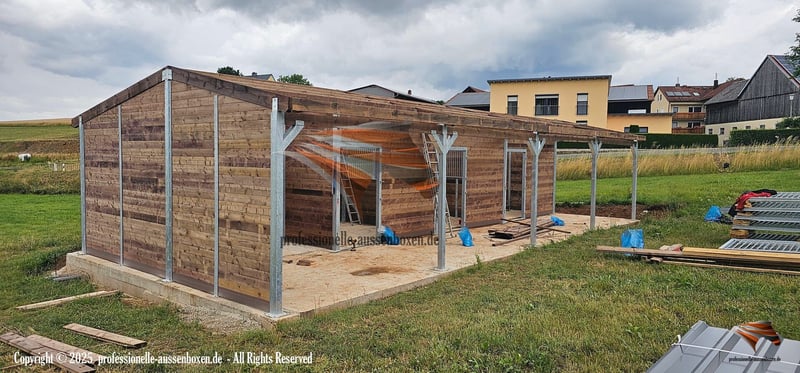 AUSSENBOXEN TEAM - strives to meet the expectations of our customers by offering products of high quality standards at attractive prices. Convince yourself of our offer and find out that we can offer you more. Dimensions: Offer for stables measuring 3x3m / 3.5x3.5m / 4.0x4.0m, other dimensions on customer request. New models with metal posts. Steel construction (galvanized)!!! Stable model PRO-BOX with flat roof (the best offer on the market) * The dimension of the stable is 3,0×3,0m 2 x BOX - dimension 6m x 3,0m - 8.600 EUR net. 4 x BOX - dimension 12m x 3,0m - 16.400 EUR net. 8 x BOX - dimension 24m x 3.0m - 32,000 EUR net. * The dimension of the stable is 3,5×3,5m 2 x BOX - dimension 7m x 3,5m - 9.050 EUR net. 4 x BOX - dimension 14m x 3,5m - 17.350 EUR net. 8 x BOX - dimension 28m x 3.5m - 33,950 EUR net. * The dimension of the stable is 4.0×4.0m 2 x BOX - dimension 8m x 4,0m - 9.500 EUR net. 4 x BOX - dimension 16m x 4,0m - 18.100 EUR net. 8 x BOX - dimension 32m x 4,0m - 35.300 EUR net. Stable model PRO - TEXAS + roof overhang 3 m, saddle roof * The dimension of the stable is 3,0×3,0m 2 x BOX - dimension 6m x 3,0m - 9.700 EUR net. 4 x BOX - dimension 12m x 3,0m - 18.300 EUR net. 8 x BOX - dimension 24m x 3,0m - 35.500 EUR net. * The dimension of the stable is 3,5×3,5m 2 x BOX - dimension 7m x 3,5m - 10.490 EUR net. 4 x BOX - dimension 14m x 3,5m - 19.890 EUR net. 8 x BOX - dimension 28m x 3,5m - 38.690 EUR net. * The dimension of the stable is 4.0×4.0m 2 x BOX - dimension 8m x 4,0m - 11.170 EUR net. 4 x BOX - dimension 16m x 4,0m - 21.170 EUR net. 8 x BOX - dimension 32m x 4,0m - 41.170 EUR net. Price: You can pay a net price if you have a valid VAT number. The VAT ID number consists of the country prefix and a numerical code (DE: ., AT: . , CH: .). If you have the number, you save money! Pay 0% VAT for transportation of goods and possibly assembly. If the buyer does not have a VAT number, we have to add 23% VAT to all net prices. The prices quoted are approximate and non-binding. Prices are subject to change without notice. Please contact us for a quotation. Professional stables for every customer! The price includes: * Height at the lowest point: 264 cm. * Height at the highest point: 310 cm - Other dimensions and heights of the stables on customer request!!! * The stable was designed in cooperation with architects from Germany and Austria. The construction meets the requirements for the highest snow and wind loads in Germany, Austria and Switzerland. * Steel construction - metal posts (galvanized). * The hot-dip galvanized steel pillar is located on each side wall. * Wall boards with a thickness of 40 mm, tongue and groove connection. * Solid galvanized steel door with locking system, upper part glazed + safety grille. * A set of assembly accessories is included in the price. * And much more ... NOTE: Important information for customers who have difficulty obtaining a permit for the construction of concrete foundations. This system simplifies the approval process and offers the opportunity to avoid the significant costs of constructing traditional concrete foundations. Visit our homepage at www.professionelle-aussenboxen.de and take a look at our photo gallery and installation videos! The screw foundation screwed into the ground - OUTDOOR BOXES - STEEL ROCK system. We cordially invite you to cooperate with us! Outdoor boxes Sp. z o.o (Ltd.) www.professionelle-aussenboxen.de T: +49 15207902872 (contact in German) - WhatsApp" Please enter your telephone number when contacting us. Thank you, AUSSENBOXEN