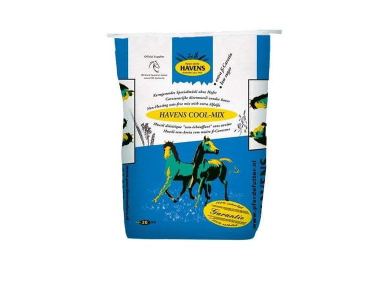 Cool-Mix (Müsli-ohne-Hafer) Cool-Mix ist ein spezielles Müsli mit leichtverdaulichem Eiweiß und extra Dinkel. Es hat einen moderaten Energiegehalt, der langsam und gleichmäßig freigesetzt wird. Dieses Produkt enthält zudem sehr wenig Zucker und ist daher optimal für Pferde geeignet, die leichtfuttrig sind oder ein nervöses Auftreten haben. Cool Mix enthält viel Beta-Carotin. Es ist das wertvollste und wichtigste Pro-Vitamin A, das im Darm des Pferdes zu Vitamin A umgewandelt wird. Die wichtigsten Eigenschaften: Haferfrei mit extra Dinkel Niedriger Zuckergehalt und leicht verdauliches Eiweiß Ideal für temperamentvolle Pferde oder leichtfuttrige Rassen Hohe Vitaminierung PRODUKTBESCHREIBUNG: Cool-Mix Cool-Mix ist ein spezielles Müsli mit einem hohen Anteil an aufgeschlossenem Getreide, welches speziell für (Sport-) Pferde und Ponys, die schnell temperamentvoll werden, konzipiert worden ist. Das Müsli besteht aus leicht verdaulichem Luzerne-Eiweiß und enthält, so wie es der Namen schon vermuten lässt, einen niedrigen Anteil Energie. In Kombination mit Dinkelspelz, wodurch die Darmtätigkeit stimuliert und ein beruhigender Effekt abgegeben wird, ist das Müsli ideal für Pferde und Ponys, die anfällig für Stress sind und/oder die schnell zu heiß werden. Cool-Mix passt daher optimal in die Futterration von Pferden und Ponys, die nur einen niedrigen Energiegehalt, aber trotzdem eine hohe Vitaminierung und Mineralisierung benötigen. Daher auch ideal für Pferde und Ponys, die aufgrund einer Verletzung nicht gearbeitet werden, sowie für robustere Rassen und temperamentvolle Pferde und Ponys. Dank des hohen Anteils an β-Carotin aus Luzerne unterstützt Cool-Mix die Fruchtbarkeit von Stuten, außerhalb der Weidesaison. Ist eure Zuchtstute anfällig für Übergewicht? Dann könnt ihr in der ersten Trächtigkeitsperiode ebenfalls unser Cool-Mix füttern. Cool-Mix ist nämlich auch bekannt als unser “Diätmüsli”. Dadurch auch sehr gut geeignet für alle Pferde und Ponys, die schnell zu dick werden. Niedriger Energiegehalt Perfekt für eine haferfreie und zucker reduzierte Futterration Enthält leicht verdauliche Proteine und einen hohen Anteil aufgeschlossenes Getreide Ideal für temperamentvolle Pferde und Ponys oder robustere Rassen Reich an Vitaminen, Mineralien und Fasern Reich an β-Carotin zur Unterstützung der Fruchtbarkeit und des Immunsystems FÜTTERUNGSEMPFEHLUNG: Es ist besonders wichtig, die Ration (Futtersorte und menge) den jeweiligen Bedürfnissen des Pferdes anzupassen. Eine allg. Richtlinie für die empfohlene tägliche Kraftfuttermenge ist: Für Unterhalt und Sport (leicht bis mittel): 0,2 - 0,5kg pro 100kg Körpergewicht Für den (Top-) Sport: 0,5 - 0,75kg pro 100kg Körpergewicht Verteilen Sie diese Tagesration auf minimal 2-3 Portionen pro Tag. Füttern Sie immer minimal 1,5-2,0% vom Körpergewicht vom Pferd/Pony an Raufutter von guter Qualität pro Tag. ausreichend frisches Trinkwasser sollte immer zur Verfügung stehen. verd. Energie (UFC) 11 MJ VEP 860 Ewpa 0,8 Macro-Nährstoffe Stärke 32,8 % Zucker 4,1 % Rohfaser 12,1 % Rohprotein 11,6 % verd. Protein 8,7 % Rohfett 2,8 % wovon ungesättigt 59 % Rohasche 7,4 % Essentielle Aminosäuren (T) Lysin 4,5 g Methionin + Cystein 3,9 g Threonin 4,3 g Tryptofan 1,4 g Vitaminierung (A): Vit A 18.000 IE Vit D-3 2.880 IE Vit E 320 mg Biotin 160 mcg Vit K3 1,3 mg Vit B1 4,0 mg Vit B2 6,6 mg Panthothenat Säure 18,7 mg Niacin 36 mg Vit B6 3,5 mg Vit B12 26,4 mcg Folsäure 3,9 mg Choline-Chlorid 200 mg Vit C Mineralien (T): Ca/P-Verhältnis 3,3 Calcium (Ca) 11,7 g Phosphor (P) 3,5 g Magnesium (Mg) 2,3 g Natrium (Na) 1,9 g Kalium (K) 12,5 g Spurenelemente (A): Eisen (Fe) 98 mg Kupfer (Cu) 13 mg Zink (Zn) 164 mg Mangan (Mn) 72 mg Kobalt (Co) 1,3 mg Jod (I) 1,0 mg Selen (Se) 200 mcg ZUSAMMENSTELLUNG: Luzerne, Maisflocken, Gerstenflocken, Dinkel, Mais aufgeschlossen, Weizen aufgeschlossen, Zuckerrohrmelasse, Weizenfuttermehl, Sojabohnenschalen(*), Calciumcarbonat, (Zucker-) Rübentrockenschnitzel, Mais(*), Sonnenblumenextraktionsschrot, Natriumchlorid, Magnesiumoxid, Dextrose, Pflanzliche Öle und Fette (Soja(*)) *hergestellt aus genetisch modifizierten Sojabohnen und/oder Mais