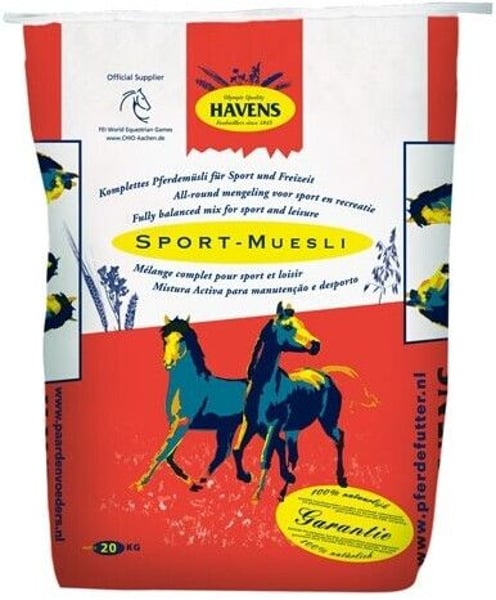 SPORT-MÜSLI Das SPORT-MÜSLI ist ein ausgewoges Pferde-Müsli, das auf den Bedarf von Sportpferden ausgerichtet ist. Das Müsli enthält u.a. Mais und Gerstenflocken, aufgeschlossenen schwarzen Hafer und Luzerne. PRODUKTBESCHREIBUNG: SPORT-Muesli SPORT-Muesli ist ein Allround-Müsli, welches für viele verschiedene Pferde und Ponys geeignet ist. Das Müsli hat einen mittleren Energiegehalt und ist aus hochwertigen Rohstoffen zusammengestellt. Das SPORT-Muesli ist sehr schmackhaft und wird hierdurch auch gerne an “schwierige Fresser” gefüttert. Es enthält u.a. Mais- und Gerstenflocken, gewalzten Schwarzhafer und Luzerne, angereichert mit einer hohen Vitaminierung. Dadurch unterstützt es die Pferde in mittlerer und schwerer Arbeit und in der allgemeinen Gesundheit und Vitalität optimal. Das Getreide ist mit Hitze vorbehandelt, wodurch dieses eine hohe Verdaulichkeit hat. Dies trägt zu einer guten Erholung nach (schwerer) Belastung bei und bringt die Pferde schnell wieder in Form. Das SPORT-Muesli wird ebenfalls sehr gerne an junge, heranwachsende Pferde (ab einem Alter von 18 Monaten, als Nachfolger vom Opti GROW) gefüttert. Für alle Arten von (Sport-) Pferden und Ponys Extra Gesundheit und Vitalität Hochwertige Proteine, die leicht verdaulich sind Mi tleres bis hohes Energieniveau & hochwertige Proteine Für eine schnelle Erholung Auch geeignet für junge Pferde ZUSAMMENSTELLUNG: Luzerne, Maisflocken, Hafer, Gerstenflocken, Weizen, Weizenfuttermehl, Zuckerrohrmelasse, Gerste, Mais aufgeschlossen, Mais(*), Sojaextraktionsschrot(*), Sonnenblumenextraktionsschrot, Maiskleber, Calciumcarbonat, Sojabohnenschalen(*), Pflanzliche Öle und Fette (Leinsamen), Soja(bohnen)proteinkonzentrat, (Zucker-) Rübentrockenschnitzel, Natriumchlorid, Monocalciumphosphat, Pflanzliche Öle und Fette (Soja(*)), Dextrose, Saccharose, Magnesiumoxid, Maltodextrin, Kartoffeleiweiß, Pflanzliche Öle und Fette (Raps) *=hergestellt aus genetisch modifizierten Sojabohnen und / oder Mais Änderungen und / oder Druckfehler vorbehalten (Mai 2024) Verpackungen: 20kg Sack und Lose (ab 2.000 kg) Produktform: Müsli T = Total A = Additiv / zugefügt Suchen Sie einen Händler in der Region? FÜTTERUNGSEMPFEHLUNG: Es ist besonders wichtig, die Ration (Futtersorte und menge) den jeweiligen Bedürfnissen des Pferdes anzupassen. Eine allg. Richtlinie für die empfohlene tägliche Kraftfuttermenge ist: Für Unterhalt und Sport (leicht bis mittel): 0,2 - 0,5kg pro 100kg Körpergewicht Für den (Top-) Sport: 0,5 - 0,75kg pro 100kg Körpergewicht Verteilen Sie diese Tagesration auf minimal 2-3 Portionen pro Tag. Füttern Sie immer minimal 1,5-2,0% vom Körpergewicht vom Pferd/Pony an Raufutter von guter Qualität pro Tag. ausreichend frisches Trinkwasser sollte immer zur Verfügung stehen Die wichtigsten Eigenschaften: geringer Eiweißgehalt enthält extra Leinöl hervorragendes Preis-Leistungsverhältnis
