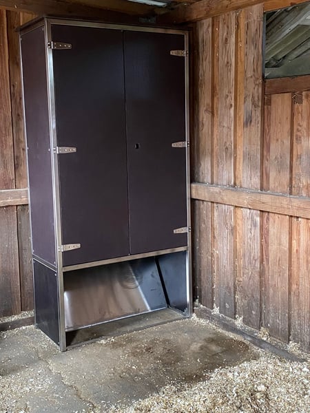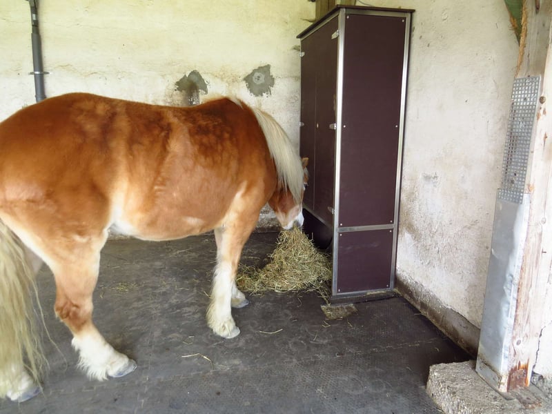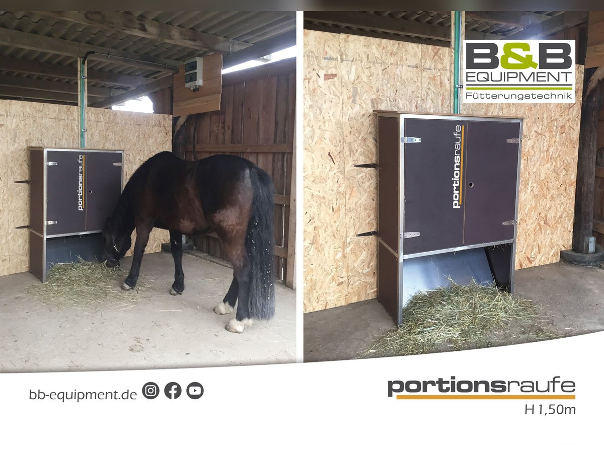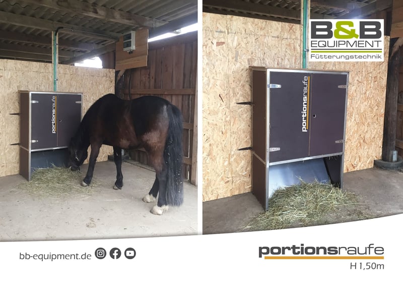 Guten Tag, der zeitgesteuerte automatischer Heuschrank für 4 Portionen zu. Mit der portionsraufe wird Ihr Pferd 24/7 optimal versorgt. Je nach Modell fasst die portionsraufe 6 - 8kg oder 10 - 12kg aufgelockertes Heu. Die Fütterungszeiten lassen sich kinderleicht einstellen. Die portionsraufe kann in der Box oder im Außenbereich stehen. An einer portionsraufe haben 2 oder 3 Pferde/Pony Platz, um in Ruhe ihr Heu zu fressen. Das Heu wird auf 4 Lagen verteilt und wird zu eingestellter Zeit freigegeben. Natürlich lassen sich auch andere Futtermittel wie z.B. Äpfel und Möhren füttern. Wir sind Ihr Partner für die zeitgesteuerte automatisierte Fütterung ihrer Tiere, ob Kraftfutter oder Raufutter. Wir freuen uns auf Ihre Nachrichten! B&B equipment GmbH Made in Germany