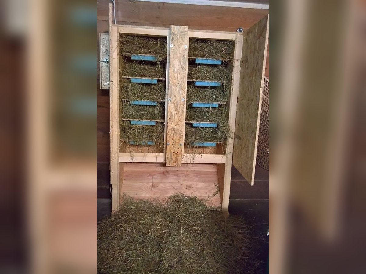 Biete Pferdefütterungsautomat (PFA), auf Ihre Bedürfnisse angepasst - PFA, geeignet für Raufutter, Heu, auch gepresst - Aus robusten Konstruktions-Holzplatten gebaut - Verschraubt und verklebt, 5 Tablare - auch mehr oder weniger Tablare möglich, 4 kg pro Tablar - Futterbefüllung von vorne, viele Varianten - Futterentnahme von vorne, oder seitlich, auch hinten (bei Bestellung angeben) - Elektrischer Anschluss 230V , 6 A, Zeitsteuerung, 5 einfache Timer - Tablare geräuschgedämpft - Geprüft, Transport nach Absprache - Masse: Breite: 1.48 m; Tiefe: 0.584 m; Höhe: 1.92 m - auch andere Masse möglich - Aufstellung der Geräte «unter Dach», trocken - PFA muss an Rückwand verschraubt werden (Stabilität) - Fronttüre verriegelbar. Können z.B. mit Klein-Karabiner gesichert werden - Lieferung (normalerweise) durch Abholung ansonsten nach Absprache