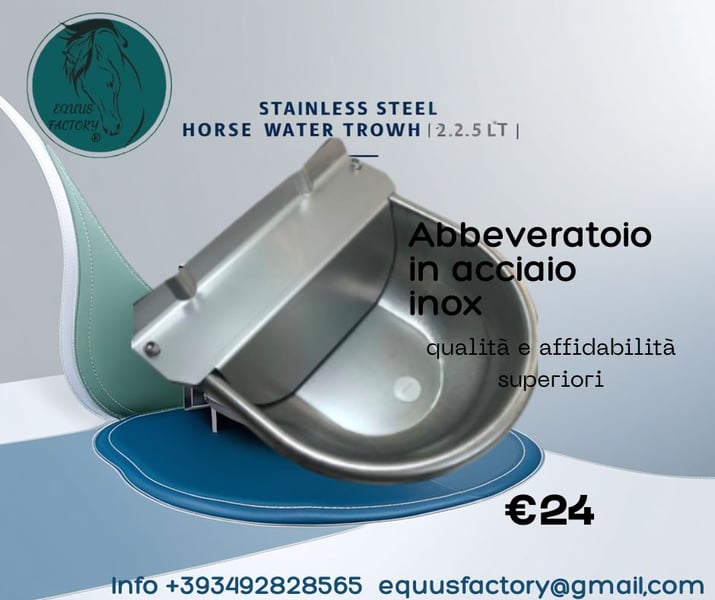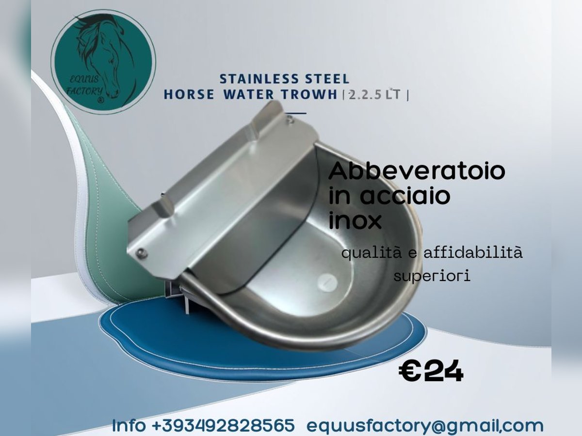 Abbeveratoio a livello costante in acciaio inox, stampato da mm.1 di spessore, tappo a vite sul fondo per la pulizia, placca in acciaio inox di copertura galleggiante con bloccaggio a vite, attacco dell’acqua sx e/o dx, capacità lt.2,5