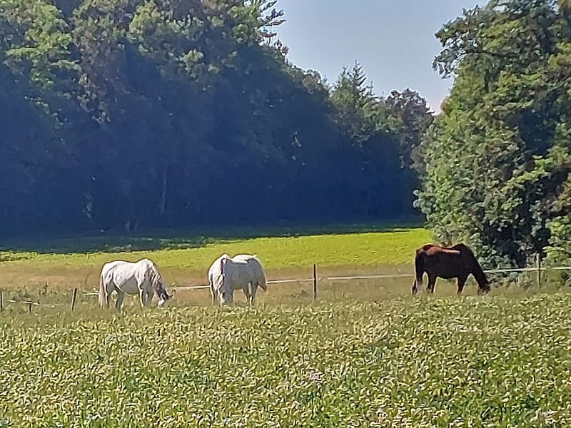 Na pięknym terenie jeździeckim znajduje się wolna stajnia z wybiegiem, przeznaczona dla konia o wzroście do 160 cm, z kopytami naturalnymi, obecnie zamieszkująca dwie białe klacze Trakehner oraz hiszpańską rasę (klacz i ogier). Mała stajnia otwarta z bezpośrednim dostępem do 1-hektarowego pastwiska, dostępnego przez 360 dni w roku. Siano z własnej produkcji, dostępne w siatce na siano, 24/7. Strefa wypoczynkowa z podłożem z leśnej ściółki. Dodatkowe wyposażenie ma miejsce w stajni dla jeźdźców, dostępna toaleta. Przy pomocy przy pracach w stajni można uzyskać bardzo korzystną cenę 450 zł miesięcznie. Odpowiedzi na pytania pod numerem 076 250 1123.